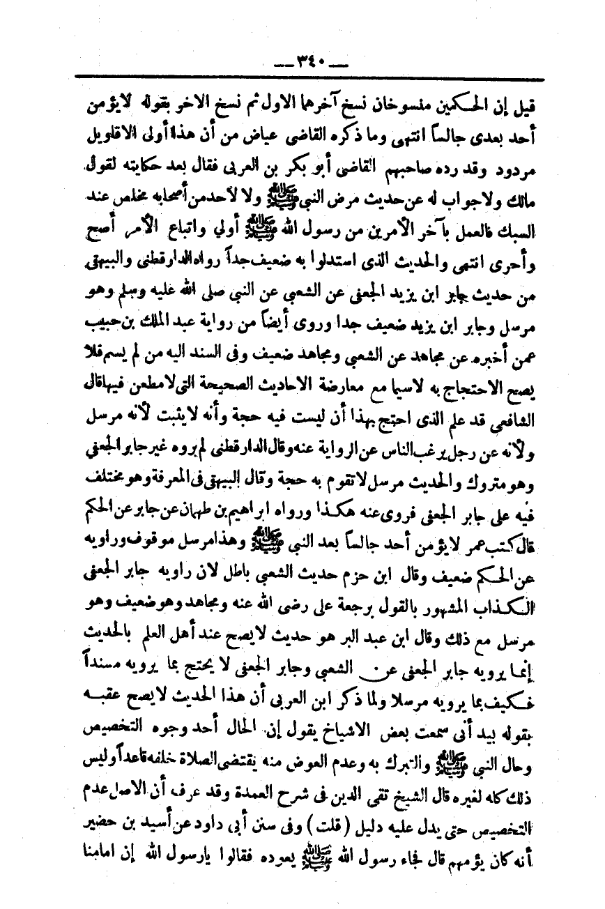 وَقَالَ الْبَيْهَقِيُّ فِي الْمَعْرِفَةِ وَهُوَ مُخْتَلَفٌ فِيهِ عَلَى جَابِرٍ الْجُعْفِيِّ فَرُوِيَ عَنْهُ هَكَذَا وَرَوَاهُ إبْرَاهِيمُ بْنُ طَهْمَانَ عَنْ جَابِرٍ عَنْ الْحَكَمِ قَالَ كَتَبَ عُمَرُ لَا يَؤُمَّنَّ أَحَدٌ جَالِسًا بَعْدَ النَّبِيِّ - صَلَّى اللَّهُ عَلَيْهِ وَسَلَّمَ - وَهَذَا مُرْسَلٌ مَوْقُوفٌ وَرَاوِيهِ عَنْ الْحَكَمِ ضَعِيفٌ وَقَالَ ابْنُ حَزْمٍ حَدِيثُ الشَّعْبِيِّ بَاطِلٌ لِأَنَّ رَاوِيَهُ جَابِرٌ الْجُعْفِيُّ الْكَذَّابُ الْمَشْهُورُ بِالْقَوْلِ بِرَجْعَةِ عَلِيٍّ - رَضِيَ اللَّهُ عَنْهُ - وَمُجَاهِدٌ وَهُوَ ضَعِيفٌ وَهُوَ مُرْسَلٌ مَعَ ذَلِكَ وَقَالَ ابْنُ عَبْدِ الْبَرِّ هُوَ حَدِيثٌ لَا يَصِحُّ عِنْدَ أَهْلِ الْعِلْمِ بِالْحَدِيثِ إنَّمَا يَرْوِيهِ جَابِرٌ الْجُعْفِيُّ عَنْ الشَّعْبِيِّ وَجَابِرٌ الْجُعْفِيُّ لَا يُحْتَجُّ بِمَا يَرْوِيهِ مُسْنَدًا فَكَيْفَ بِمَا يَرْوِيهِ مُرْسَلًا وَلَمَّا ذَكَرَ ابْنُ الْعَرَبِيِّ أَنَّ هَذَا الْحَدِيثَ لَا يَصِحُّ عَقَّبَهُ بِقَوْلِهِ بَيْدَ أَنِّي سَمِعْت بَعْضَ الْأَشْيَاخِ يَقُولُ إنَّ الْحَالَ أَحَدُ وُجُوهِ التَّخْصِيصِ وَحَالُ النَّبِيِّ - صَلَّى اللَّهُ عَلَيْهِ وَسَلَّمَ - وَالتَّبَرُّكُ بِهِ وَعَدَمُ الْعِوَضِ مِنْهُ يَقْتَضِي الصَّلَاةَ خَلْفَهُ قَاعِدًا وَلَيْسَ ذَلِكَ كُلُّهُ لِغَيْرِهِ قَالَ الشَّيْخُ تَقِيُّ الدِّينِ فِي شَرْحِ الْعُمْدَةِ.