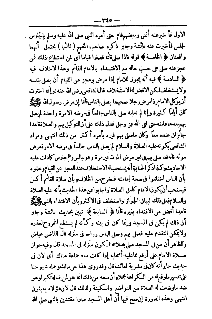 وَمُرَادُ الشَّافِعِيِّ بِكَوْنِهِ - عَلَيْهِ الصَّلَاةُ وَالسَّلَامُ - لَمْ يُصَلِّ بِالنَّاسِ جَالِسًا فِي مَرَضِهِ إلَّا مَرَّةَ مَرَضِ مَوْتِهِ فَإِنَّهُ قَدْ صَلَّى بِهِمْ فِي غَيْرِ مَرَضِ الْمَوْتِ غَيْرَ مَرَّةٍ وَهُوَ جَالِسٌ وَهُمْ جُلُوسٌ كَمَا دَلَّتْ عَلَيْهِ الْأَحَادِيثُ وَكَذَا ذَكَرَ الْحَنَابِلَةُ أَنَّهُ يُسْتَحَبُّ لَهُ الِاسْتِخْلَافُ عِنْدَ الْعَجْزِ عَنْ الْقِيَامِ وَعَلَّلُوهُ بِأَنَّ النَّاسَ اخْتَلَفُوا فِي صِحَّةِ إمَامَتِهِ فَنَخْرُجُ مِنْ الْخِلَافِ وَبِأَنَّ صَلَاةَ الْقَائِمِ أَكْمَلُ فَيُسْتَحَبُّ أَنْ يَكُونَ الْإِمَامُ كَامِلَ الصَّلَاةِ وَأَجَابُوا عَنْ هَذَا الْحَدِيثِ بِأَنَّهُ - عَلَيْهِ الصَّلَاةُ وَالسَّلَامُ - فَعَلَ ذَلِكَ لِبَيَانِ الْجَوَازِ وَاسْتَخْلَفَ فِي الْأَكْثَرِ وَبِأَنَّ الِاقْتِدَاءَ بِالنَّبِيِّ - صَلَّى اللَّهُ عَلَيْهِ وَسَلَّمَ - قَاعِدًا أَفْضَلُ مِنْ الِاقْتِدَاءِ بِغَيْرِهِ قَائِمًا.