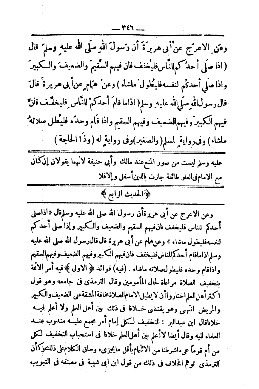 (الْحَدِيثُ الرَّابِعُ) وَعَنْ الْأَعْرَجِ عَنْ أَبِي هُرَيْرَةَ أَنَّ رَسُولَ اللَّهِ - صَلَّى اللَّهُ عَلَيْهِ وَسَلَّمَ - قَالَ «إذَا صَلَّى أَحَدُكُمْ لِلنَّاسِ فَلْيُخَفِّفْ فَإِنَّ فِيهِمْ السَّقِيمَ وَالضَّعِيفَ وَالْكَبِيرَ وَإِذَا صَلَّى أَحَدُكُمْ لِنَفْسِهِ فَلْيُطَوِّلْ مَا شَاءَ» .