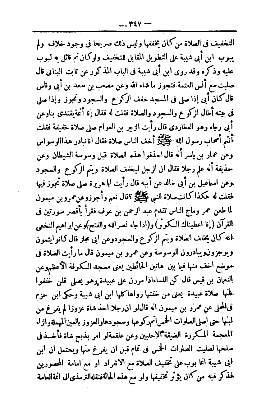 وَقَدْ رَوَى ابْنُ أَبِي شَيْبَةَ فِي الْبَابِ الْمَذْكُورِ عَنْ ثَابِتٍ الْبُنَانِيَّ قَالَ صَلَّيْت مَعَ أَنَسٍ الْعَتَمَةَ فَتَجَوَّزَ مَا شَاءَ اللَّهُ وَعَنْ مُصْعَبِ بْنِ سَعْدِ بْنِ أَبِي وَقَّاصٍ قَالَ كَانَ أَبِي إذَا صَلَّى فِي الْمَسْجِدِ خَفَّفَ الرُّكُوعَ وَالسُّجُودَ وَتَجَوَّزَ وَإِذَا صَلَّى فِي بَيْتِهِ أَطَالَ الرُّكُوعَ وَالسُّجُودَ وَالصَّلَاةَ فَقُلْتُ لَهُ فَقَالَ إنَّا أَئِمَّةٌ يُقْتَدَى بِنَا وَعَنْ أَبِي رَجَاءٍ وَهُوَ الْعُطَارِدِيُّ قَالَ رَأَيْت الزُّبَيْرَ بْنَ الْعَوَّامِ صَلَّى صَلَاةً خَفِيفَةً فَقُلْت أَنْتُمْ أَصْحَابَ رَسُولِ اللَّهِ - صَلَّى اللَّهُ عَلَيْهِ وَسَلَّمَ - أَخَفُّ النَّاسِ صَلَاةً فَقَالَ إنَّا نُبَادِرُ هَذَا الْوَسْوَاسَ.