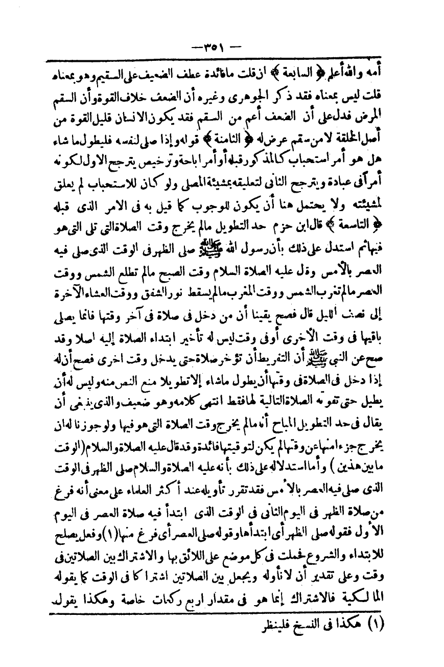 {الثَّامِنَةُ} قَوْلُهُ وَإِذَا صَلَّى لِنَفْسِهِ فَلْيُطَوِّلْ مَا شَاءَ هَلْ هُوَ أَمْرُ اسْتِحْبَابٍ كَالْمَذْكُورِ قَبْلَهُ أَوْ أَمْرُ إبَاحَةٍ وَتَرْخِيصٍ يَتَرَجَّحُ الْأَوَّلُ لِكَوْنِهِ أَمْرًا فِي عِبَادَةٍ وَيَتَرَجَّحُ الثَّانِي لِتَعْلِيقِهِ بِمَشِيئَةِ الْمُصَلِّي وَلَوْ كَانَ لِلِاسْتِحْبَابِ لَمْ يُعَلَّقْ لِمَشِيئَتِهِ وَلَا يُحْتَمَلُ هُنَا أَنْ يَكُونَ لِلْوُجُوبِ كَمَا قِيلَ بِهِ فِي الْأَمْرِ الَّذِي قَبْلَهُ {التَّاسِعَةُ} قَالَ ابْنُ حَزْمٍ حَدُّ التَّطْوِيلِ مَا لَمْ يَخْرُجْ وَقْتُ الصَّلَاةِ الَّتِي تَلِي الَّتِي هُوَ فِيهَا ثُمَّ اسْتَدَلَّ عَلَى ذَلِكَ بِأَنَّ رَسُولَ اللَّهِ - صَلَّى اللَّهُ عَلَيْهِ وَسَلَّمَ - صَلَّى الظُّهْرَ فِي الْوَقْتِ الَّذِي صَلَّى فِيهِ الْعَصْرَ بِالْأَمْسِ وَقَالَ - عَلَيْهِ الصَّلَاةُ وَالسَّلَامُ - «وَقْتُ الصُّبْحِ مَا لَمْ تَطْلُعْ الشَّمْسُ وَوَقْتُ الْعَصْرِ مَا لَمْ تَغْرُبْ الشَّمْسُ وَوَقْتُ الْمَغْرِبِ مَا لَمْ يَسْقُطْ نُورُ الشَّفَقِ وَوَقْتُ الْعِشَاءِ الْآخِرَةِ إلَى نِصْفِ اللَّيْلِ» .