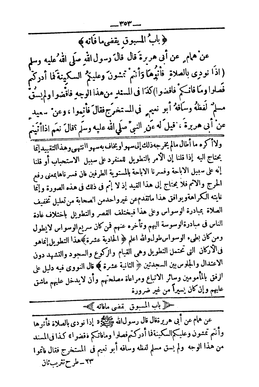بَابُ الْمَسْبُوقِ يَقْضِي مَا فَاتَهُ عَنْ هَمَّامٍ عَنْ أَبِي هُرَيْرَةَ قَالَ قَالَ رَسُولُ اللَّهِ - صَلَّى اللَّهُ عَلَيْهِ وَسَلَّمَ - «إذَا نُودِيَ بِالصَّلَاةِ فَأْتُوهَا وَأَنْتُمْ تَمْشُونَ وَعَلَيْكُمْ السَّكِينَةُ فَمَا أَدْرَكْتُمْ فَصَلُّوا وَمَا فَاتَكُمْ فَاقْضُوا» كَذَا فِي الْمُسْنَدِ مِنْ هَذَا الْوَجْهِ فَاقْضُوا وَلَمْ يَسُقْ مُسْلِمٌ لَفْظَهُ وَسَاقَهُ أَبُو نُعَيْمٍ فِي الْمُسْتَخْرَجِ فَقَالَ «فَأَتِمُّوا» ، وَعَنْ سَعِيدٍ عَنْ أَبِي هُرَيْرَةَ، قِيلَ لَهُ عَنْ النَّبِيِّ - صَلَّى اللَّهُ عَلَيْهِ وَسَلَّمَ -؟ قَالَ نَعَمْ «إذَا أَتَيْتُمْ