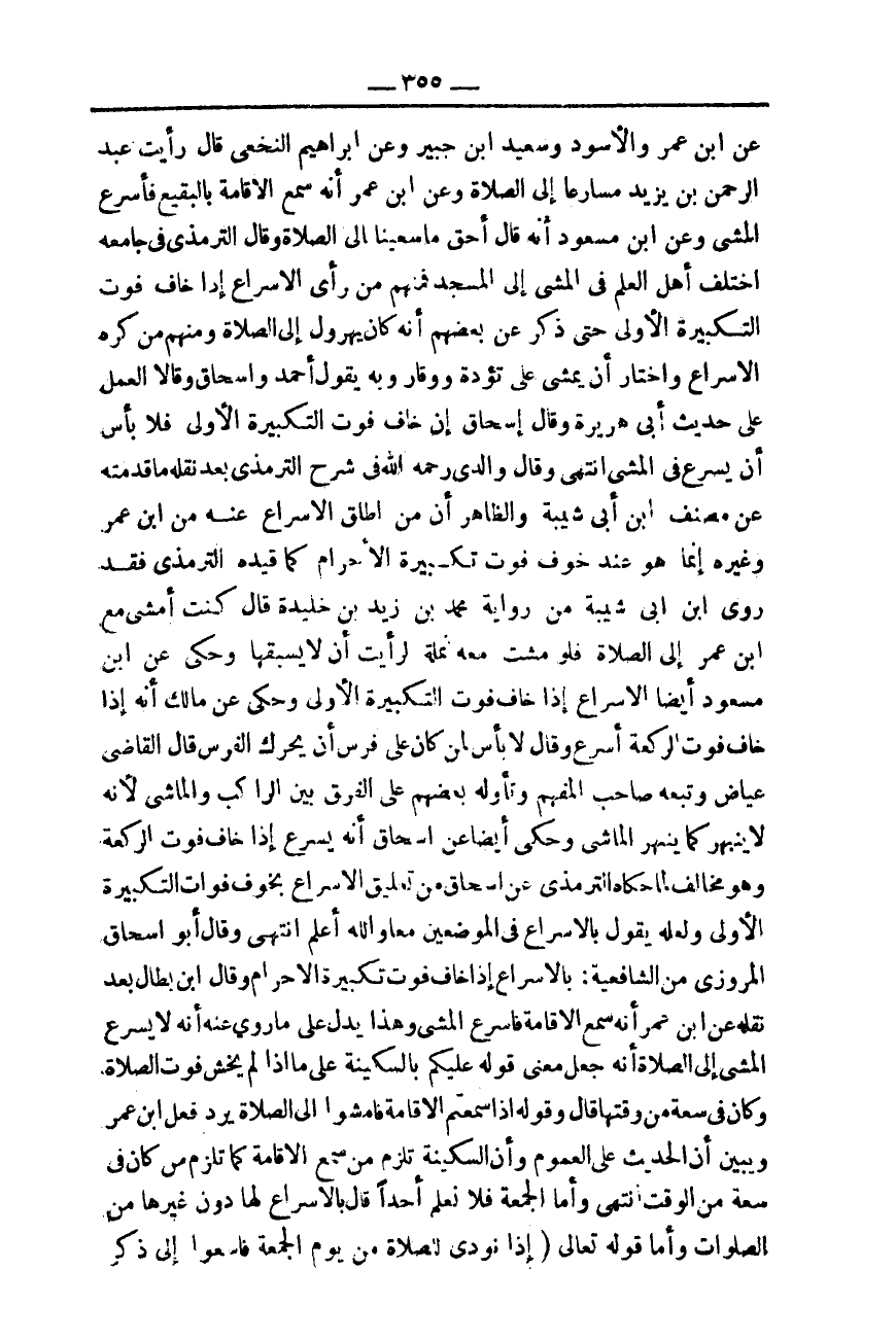 ـــــــــــــــــــــــــــــQعَنْ ابْنِ عُمَرَ وَالْأَسْوَدِ وَسَعِيدِ بْنِ جُبَيْرٍ وَعَنْ إبْرَاهِيمَ النَّخَعِيّ قَالَ رَأَيْتُ عَبْدَ الرَّحْمَنِ بْنَ يَزِيدَ مُسَارِعًا إلَى الصَّلَاةِ وَعَنْ ابْنِ عُمَرَ أَنَّهُ سَمِعَ الْإِقَامَةَ بِالْبَقِيعِ فَأَسْرَعَ الْمَشْيَ.