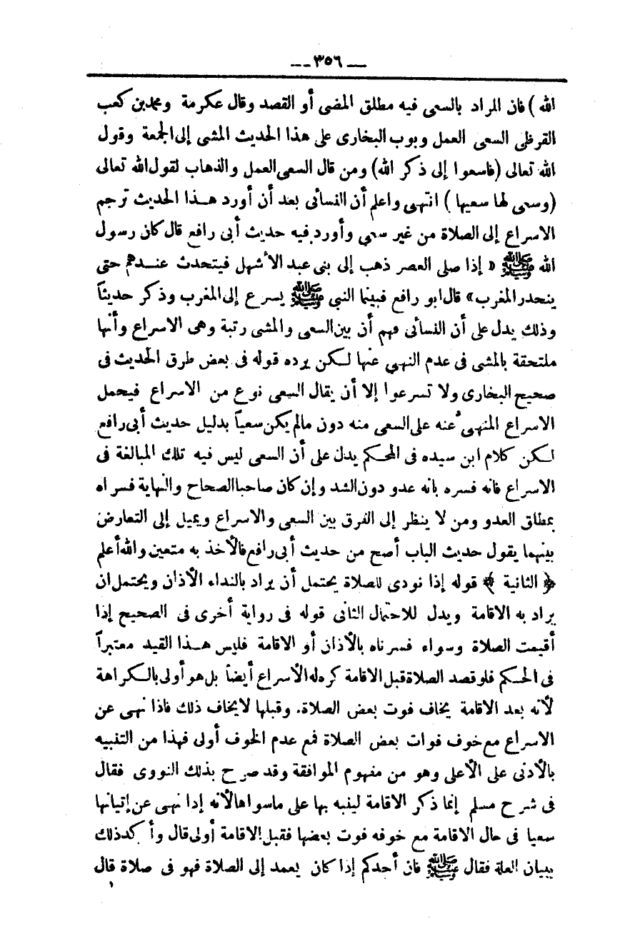 وَذَكَرَ حَدِيثًا وَذَلِكَ يَدُلُّ عَلَى أَنَّ النَّسَائِيّ فَهِمَ أَنَّ بَيْنَ السَّعْيِ وَالْمَشْيِ رُتْبَةً وَهِيَ الْإِسْرَاعُ وَأَنَّهَا مُلْتَحِقَةٌ بِالْمَشْيِ فِي عَدَمِ النَّهْيِ عَنْهَا لَكِنْ يَرُدُّهُ قَوْلُهُ فِي بَعْضِ طُرُقِ الْحَدِيثِ فِي صَحِيحِ الْبُخَارِيِّ وَلَا تُسْرِعُوا إلَّا أَنْ يُقَالَ السَّعْيُ نَوْعٌ مِنْ الْإِسْرَاعِ فَيُحْمَلُ الْإِسْرَاعُ الْمَنْهِيُّ عَنْهُ عَلَى السَّعْيِ مِنْهُ دُونَ مَا لَمْ يَكُنْ سَعْيًا بِدَلِيلِ حَدِيثِ أَبِي رَافِعٍ لَكِنَّ كَلَامَ ابْنِ سِيدَهْ فِي الْمُحْكَمِ يَدُلُّ عَلَى أَنَّ السَّعْيَ لَيْسَ فِيهِ تِلْكَ الْمُبَالَغَةُ فِي الْإِسْرَاعِ فَإِنَّهُ فَسَّرَهُ بِأَنَّهُ عَدْوٌ دُونَ الشَّدِّ وَإِنْ كَانَ صَاحِبَا الصِّحَاحِ وَالنِّهَايَةِ فَسَّرَاهُ بِمُطْلَقِ الْعَدْوِ وَمَنْ لَا يَنْظُرُ إلَى الْفَرْقِ بَيْنَ السَّعْيِ وَالْإِسْرَاعِ وَيَمِيلُ إلَى التَّعَارُضِ بَيْنَهُمَا يَقُولُ حَدِيثُ الْبَابِ أَصَحُّ مِنْ حَدِيثِ أَبِي رَافِعٍ فَالْأَخْذُ بِهِ مُتَعَيَّنٌ وَاَللَّهُ أَعْلَمُ.