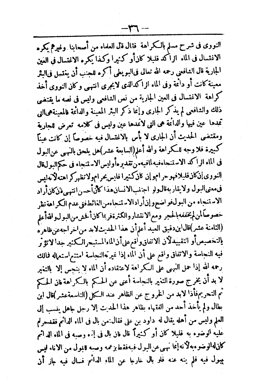 (التَّاسِعَةَ عَشَرَ) قَالَ ابْنُ بَطَّالٍ: وَلَمْ يَأْخُذْ أَحَدٌ مِنْ الْفُقَهَاءِ بِظَاهِرِ هَذَا الْحَدِيثِ إلَّا رَجُلٌ يُنْسَبُ إلَى الْعِلْمِ وَلَيْسَ مِنْ أَهْلِهِ يُقَالُ لَهُ دَاوُد بْنُ عَلِيٍّ فَقَالَ: مَنْ بَالَ فِي الْمَاءِ الدَّائِمِ فَقَدْ حَرُمَ عَلَيْهِ الْوُضُوءُ بِهِ قَلِيلًا كَانَ أَوْ كَثِيرًا قَالَ: فَإِنْ بَالَ فِي إنَاءٍ وَصَبَّهُ فِي الْمَاءِ الدَّائِمِ كَانَ لَهُ الْوُضُوءُ بِهِ؛ لِأَنَّهُ إنَّمَا نُهِيَ عَنْ الْبَوْلِ فِيهِ فَقَطْ بِزَعْمِهِ، وَصَبُّهُ لِلْبَوْلِ مِنْ الْإِنَاءِ لَيْسَ بِبَوْلٍ فِيهِ فَلَمْ يُنْهَ عَنْهُ.