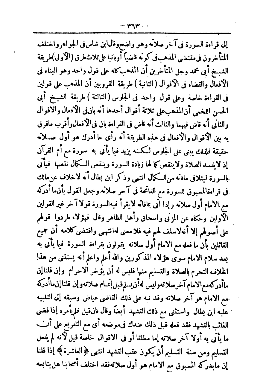 (الثَّالِثَةُ) طَرِيقَةُ الشَّيْخِ أَبِي الْحَسَنِ اللَّخْمِيِّ أَنَّ الْمَذْهَبَ عَلَى ثَلَاثَةِ أَقْوَالٍ أَحَدِهَا أَنَّهُ بَانٍ فِي الْأَفْعَالِ وَالْأَقْوَالِ وَالثَّانِي أَنَّهُ قَاضٍ فِيهِمَا وَالثَّالِثِ أَنَّهُ قَاضٍ فِي الْقِرَاءَةِ بَانٍ فِي الْأَفْعَالِ وَأَقْرَبُ مَا فَرَّقَ بِهِ بَيْنَ الْأَقْوَالِ وَالْأَفْعَالِ فِي هَذِهِ الطَّرِيقَةِ أَنَّهُ رَأَى مَا أَدْرَكَ هُوَ أَوَّلُ صَلَاتِهِ حَقِيقَةً فَلِذَلِكَ يَبْنِي عَلَى الْجُلُوسِ لَكِنَّهُ يَزِيدُ فِيمَا يَأْتِي بِهِ سُورَةً مَعَ أُمِّ الْقُرْآنِ إذْ لَا يُفْسِدُ الصَّلَاةَ وَلَا يَنْقُصُ كَمَالَهَا زِيَادَةُ السُّورَةِ وَيَنْقُصُ الْكَمَالَ نَقْصُهَا فَيَأْتِي بِالسُّورَةِ لِيَتَلَافَى مَا فَاتَهُ مِنْ الْكَمَالِ انْتَهَى.