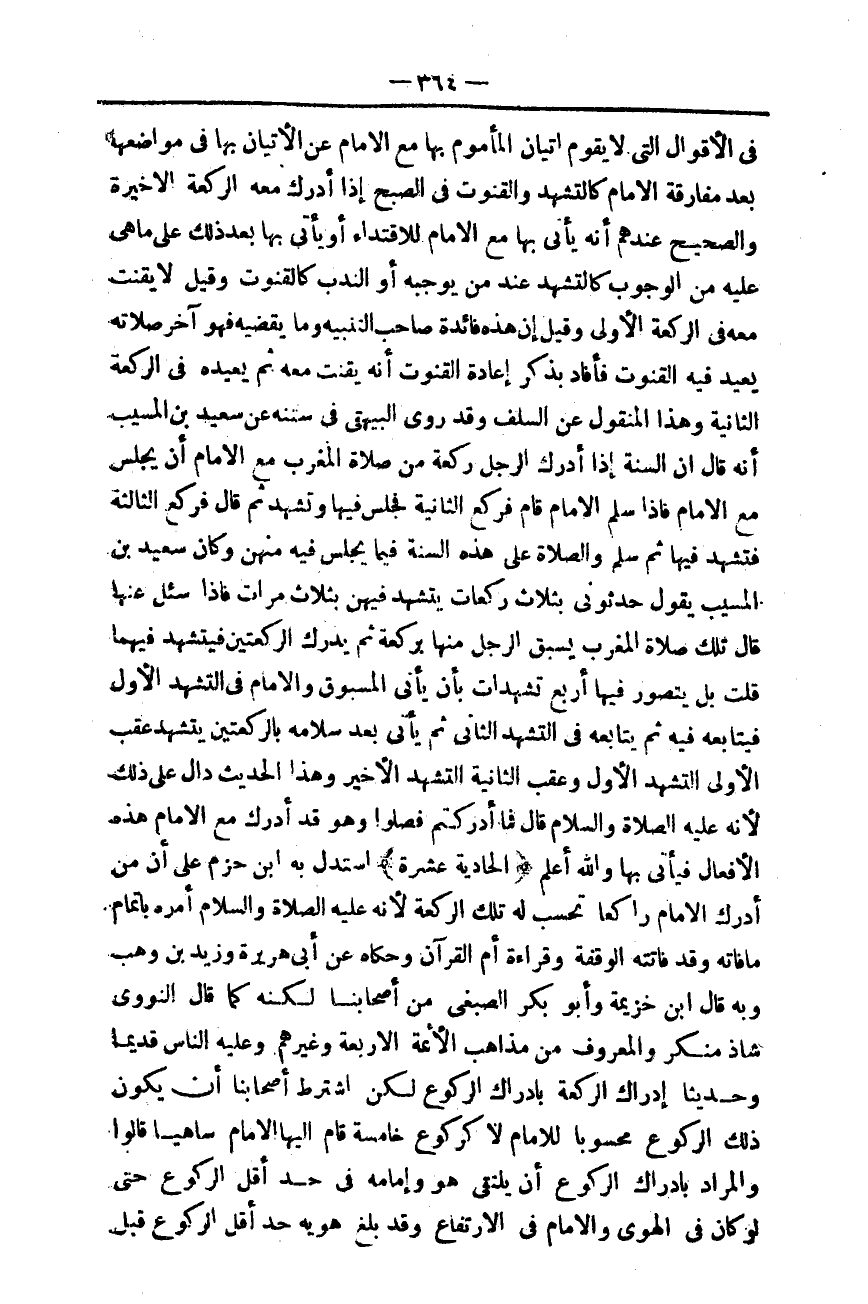 وَقَدْ رَوَى الْبَيْهَقِيُّ فِي سُنَنِهِ عَنْ سَعِيدِ بْنِ الْمُسَيِّبِ أَنَّهُ قَالَ: إنَّ السُّنَّةَ إذَا أَدْرَكَ الرَّجُلُ رَكْعَةً مِنْ صَلَاةِ الْمَغْرِبِ مَعَ الْإِمَامِ أَنْ يَجْلِسَ مَعَ الْإِمَامِ فَإِذَا سَلَّمَ الْإِمَامُ قَامَ فَرَكَعَ الثَّانِيَةَ فَجَلَسَ فِيهَا وَتَشَهَّدَ ثُمَّ قَامَ فَرَكَعَ الثَّالِثَةَ فَتَشَهَّدَ فِيهَا ثُمَّ سَلَّمَ وَالصَّلَاةُ عَلَى هَذِهِ السُّنَّةِ فِيمَا يَجْلِسُ فِيهِ مِنْهُنَّ وَكَانَ سَعِيدُ بْنُ الْمُسَيِّبِ يَقُولُ حَدِّثُونِي بِثَلَاثِ رَكَعَاتٍ يُتَشَهَّدُ فِيهِنَّ بِثَلَاثِ مَرَّاتٍ فَإِذَا سُئِلَ عَنْهَا قَالَ تِلْكَ صَلَاةُ الْمَغْرِبِ يُسْبَقُ الرَّجُلُ مِنْهَا بِرَكْعَةٍ ثُمَّ يُدْرِكُ الرَّكْعَتَيْنِ فَيَتَشَهَّدُ فِيهِمَا قُلْتُ بَلْ يُتَصَوَّرُ فِيهَا أَرْبَعُ تَشَهُّدَاتٍ بِأَنْ يَأْتِيَ الْمَسْبُوقُ وَالْإِمَامُ فِي التَّشَهُّدِ الْأَوَّلِ فَيُتَابِعَهُ فِيهِ ثُمَّ يُتَابِعَهُ فِي التَّشَهُّدِ الثَّانِي ثُمَّ يَأْتِيَ بَعْدَ سَلَامِهِ بِالرَّكْعَتَيْنِ يَتَشَهَّدُ عَقِبَ الْأُولَى التَّشَهُّدَ الْأَوَّلَ وَعَقِبَ الثَّانِيَةِ التَّشَهُّدَ الْأَخِيرَ.