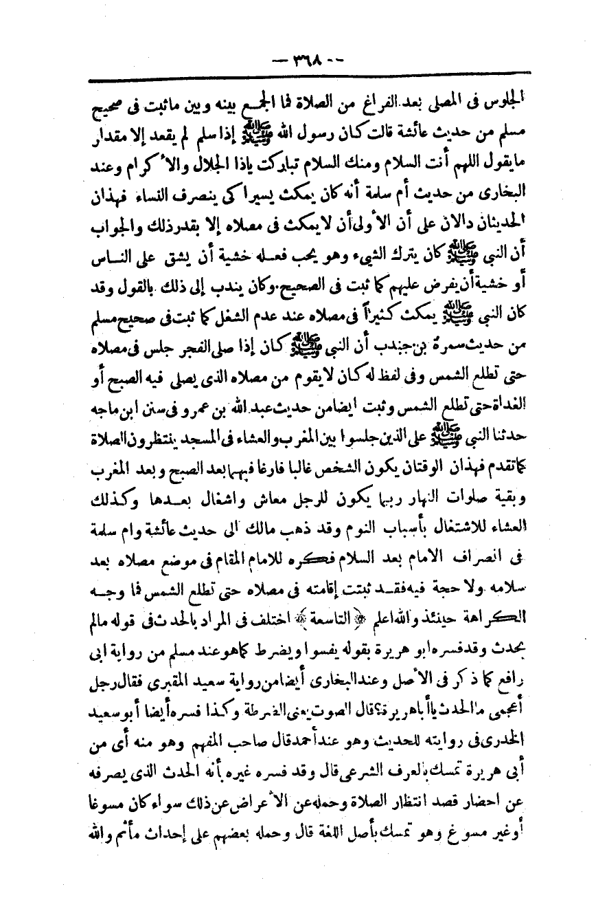 فَهَذَانِ الْحَدِيثَانِ دَالَّانِ عَلَى أَنَّ الْأَوْلَى أَنْ لَا يَمْكُثَ فِي مُصَلَّاهُ إلَّا بِقَدْرِ ذَلِكَ وَالْجَوَابُ أَنَّ النَّبِيَّ - صَلَّى اللَّهُ عَلَيْهِ وَسَلَّمَ - كَانَ يَتْرُكُ الشَّيْءَ وَهُوَ يُحِبُّ فِعْلَهُ خَشْيَةَ أَنْ يَشُقَّ عَلَى النَّاسِ أَوْ خَشْيَةَ أَنْ يُفْرَضَ عَلَيْهِمْ كَمَا ثَبَتَ فِي الصَّحِيحِ وَكَانَ يَنْدُبُ إلَى ذَلِكَ بِالْقَوْلِ وَقَدْ كَانَ النَّبِيُّ - صَلَّى اللَّهُ عَلَيْهِ وَسَلَّمَ - يَمْكُثُ كَثِيرًا فِي مُصَلَّاهُ عِنْدَ عَدَمِ الشُّغْلِ كَمَا ثَبَتَ فِي صَحِيحِ مُسْلِمٍ مِنْ حَدِيثِ سَمُرَةَ بْنِ جُنْدَبٍ «أَنَّ النَّبِيَّ - صَلَّى اللَّهُ عَلَيْهِ وَسَلَّمَ - كَانَ إذَا صَلَّى الْفَجْرَ جَلَسَ فِي مُصَلَّاهُ حَتَّى تَطْلُعَ الشَّمْسُ» وَفِي لَفْظٍ لَهُ «كَانَ لَا يَقُومُ مِنْ مُصَلَّاهُ الَّذِي يُصَلِّي فِيهِ الصُّبْحَ أَوْ الْغَدَاةَ حَتَّى تَطْلُعَ الشَّمْسُ» وَثَبَتَ أَيْضًا مِنْ حَدِيثِ عَبْدِ اللَّهِ بْنِ عَمْرٍو فِي سُنَنِ ابْنِ مَاجَهْ حَدَّثَنَا النَّبِيُّ - صَلَّى اللَّهُ عَلَيْهِ وَسَلَّمَ - عَلَى الَّذِينَ جَلَسُوا بَيْنَ الْمَغْرِبِ وَالْعِشَاءِ فِي الْمَسْجِدِ يَنْتَظِرُونَ الصَّلَاةَ كَمَا تَقَدَّمَ فَهَذَانِ الْوَقْتَانِ يَكُونُ الشَّخْصُ غَالِبًا فَارِغًا فِيهِمَا بَعْدَ الصُّبْحِ وَبَعْدَ الْمَغْرِبِ وَبَقِيَّةُ صَلَوَاتِ النَّهَارِ رُبَّمَا يَكُونُ لِلرَّجُلِ مَعَاشٌ وَأَشْغَالٌ بَعْدَهَا وَكَذَلِكَ الْعِشَاءُ لِلِاشْتِغَالِ بِأَسْبَابِ النَّوْمِ وَقَدْ ذَهَبَ مَالِكٌ إلَى حَدِيثِ عَائِشَةَ وَأُمِّ سَلَمَةَ فِي انْصِرَافِ الْإِمَامِ بَعْدَ السَّلَامِ فَكَرِهَ لِلْإِمَامِ الْمُقَامَ فِي مَوْضِعِ مُصَلَّاهُ بَعْدَ سَلَامِهِ وَلَا حُجَّةَ فِيهِ فَقَدْ ثَبَتَتْ إقَامَتُهُ فِي مُصَلَّاهُ حَتَّى تَطْلُعَ الشَّمْسُ فَمَا وَجْهُ الْكَرَاهَةِ حِينَئِذٍ وَاَللَّهُ أَعْلَمُ.