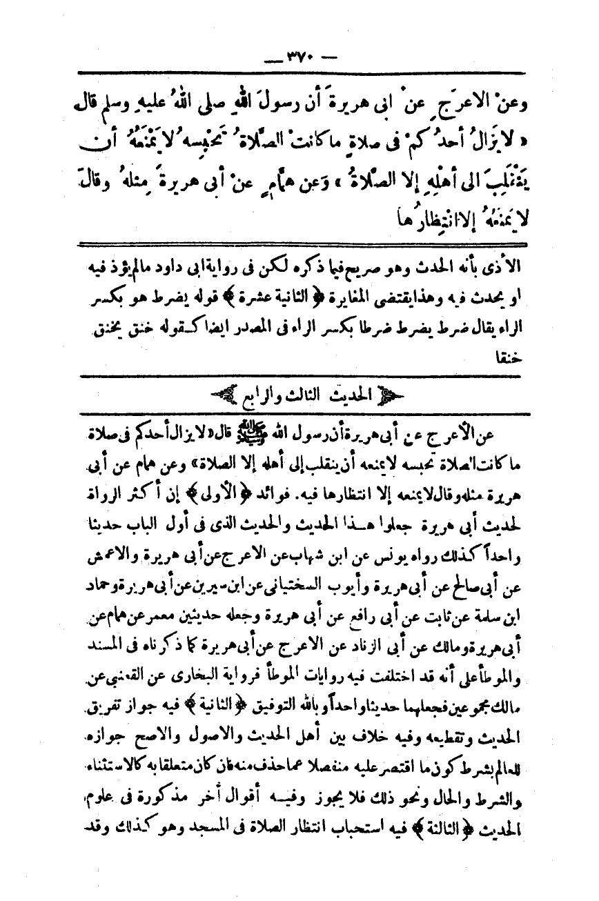 {الْحَدِيثُ الثَّالِثُ وَالرَّابِعُ} عَنْ الْأَعْرَجِ عَنْ أَبِي هُرَيْرَةَ أَنَّ رَسُولَ اللَّهِ - صَلَّى اللَّهُ عَلَيْهِ وَسَلَّمَ - قَالَ «لَا يَزَالُ أَحَدُكُمْ فِي صَلَاةٍ مَا كَانَتْ الصَّلَاةُ تَحْبِسُهُ لَا يَمْنَعُهُ أَنْ يَنْقَلِبَ إلَى أَهْلِهِ إلَّا الصَّلَاةُ» وَعَنْ هَمَّامٍ عَنْ أَبِي هُرَيْرَةَ مِثْلُهُ وَقَالَ «لَا يَمْنَعُهُ إلَّا انْتِظَارُهَا» فِيهِ فَوَائِدُ: