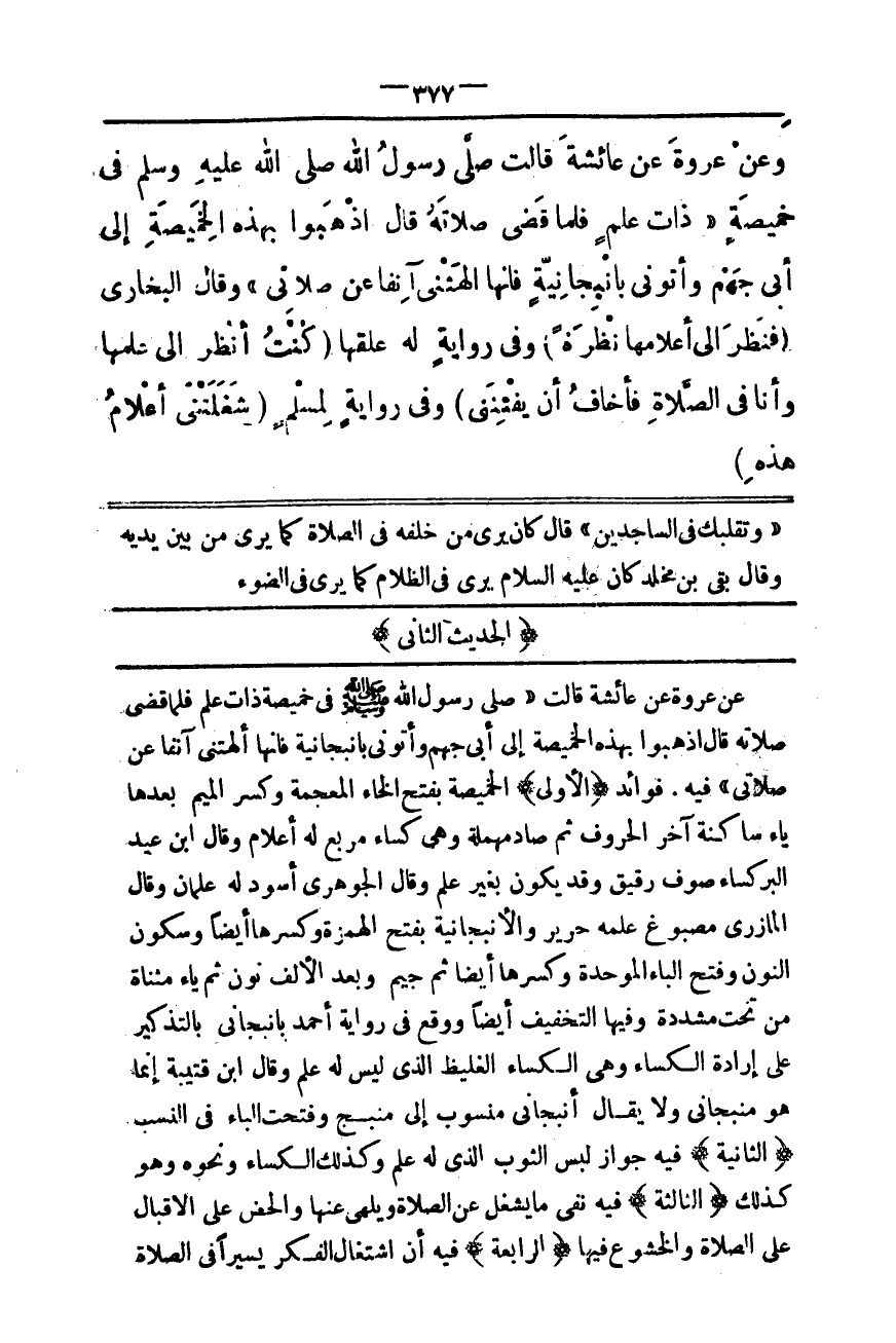 الْحَدِيثُ الثَّانِي عَنْ عُرْوَةَ عَنْ عَائِشَةَ قَالَتْ «صَلَّى رَسُولُ اللَّهِ - صَلَّى اللَّهُ عَلَيْهِ وَسَلَّمَ - فِي خَمِيصَةٍ ذَاتِ عَلَمٍ فَلَمَّا قَضَى صَلَاتَهُ قَالَ اذْهَبُوا بِهَذِهِ الْخَمِيصَةِ إلَى أَبِي جَهْمٍ وَأْتُونِي بِأَنْبِجَانِيَّةٍ فَإِنَّهَا أَلْهَتْنِي آنِفًا عَنْ صَلَاتِي» .