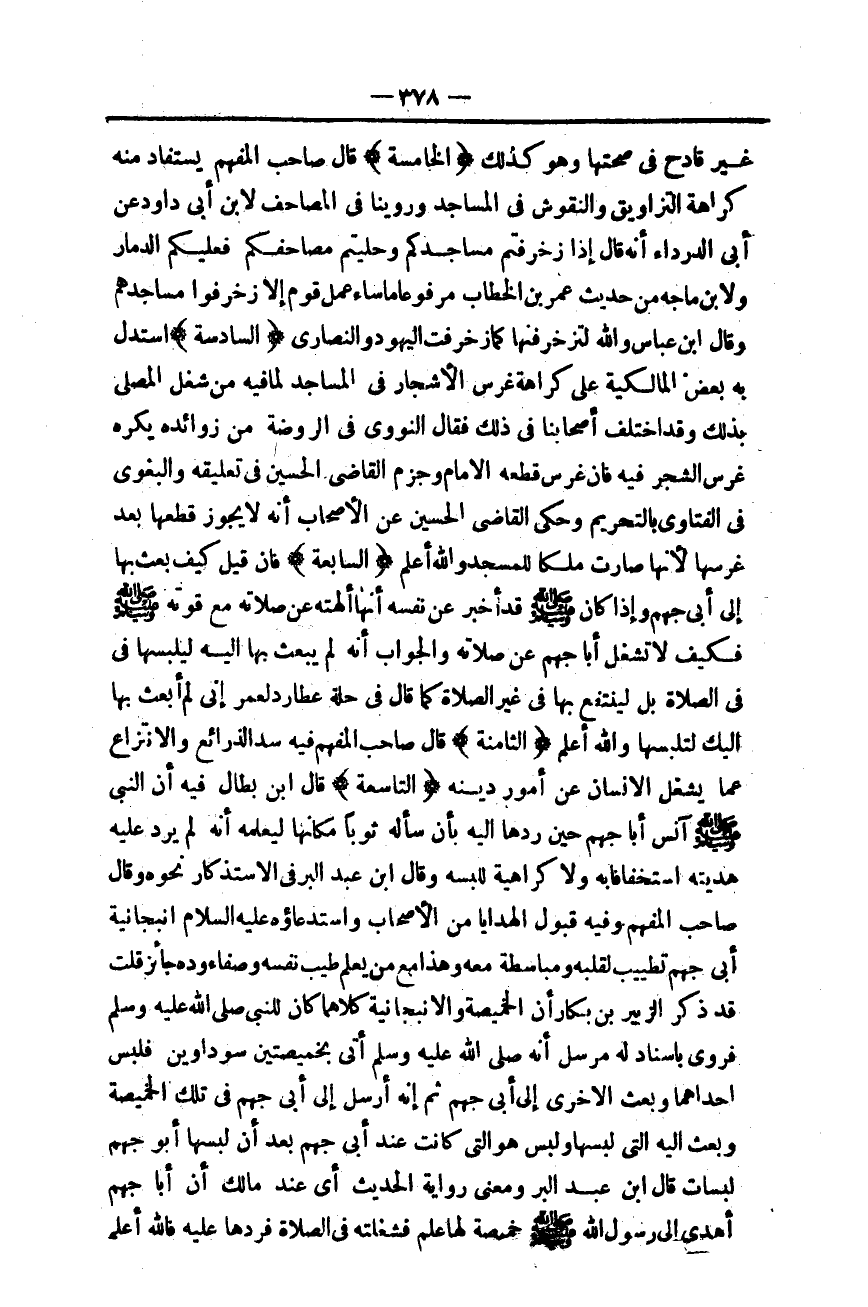 {الْخَامِسَةُ} قَالَ صَاحِبُ الْمُفْهِمِ يُسْتَفَادُ مِنْهُ كَرَاهَةُ التَّزَاوِيقِ وَالنُّقُوشِ فِي الْمَسَاجِدِ وَرَوَيْنَا فِي الْمَصَاحِفِ لِابْنِ أَبِي دَاوُد عَنْ أَبِي الدَّرْدَاءِ أَنَّهُ قَالَ إذَا زَخْرَفْتُمْ مَسَاجِدَكُمْ وَحَلَّيْتُمْ مُصْحَفَكُمْ فَعَلَيْكُمْ الدَّمَارُ وَلِابْنِ مَاجَهْ مِنْ حَدِيثِ عُمَرَ بْنِ الْخَطَّابِ مَرْفُوعًا «مَا سَاءَ عَمَلُ قَوْمٍ إلَّا زَخْرَفُوا مَسَاجِدَهُمْ» وَقَالَ ابْنُ عَبَّاسٍ وَاَللَّهِ لَتُزَخْرِفُنَّهَا كَمَا زَخْرَفَتْ الْيَهُودُ وَالنَّصَارَى.