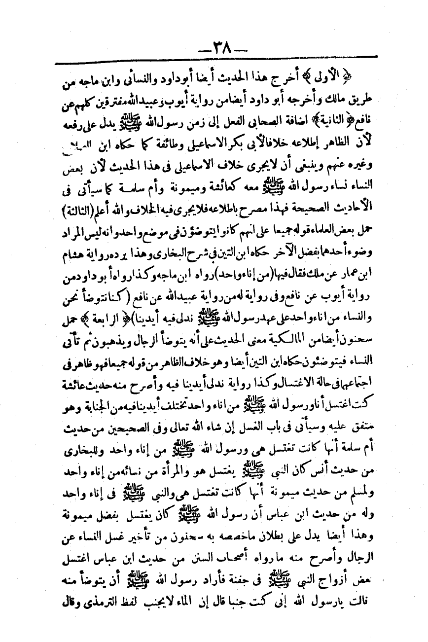 (الثَّالِثَةُ) حَمَلُ بَعْضُ الْعُلَمَاءِ قَوْلَهُ جَمِيعًا عَلَى أَنَّهُمْ كَانُوا يَتَوَضَّئُونَ فِي مَوْضِعٍ وَاحِدٍ، وَأَنَّهُ لَيْسَ الْمُرَادُ وُضُوءَ أَحَدِهِمَا بِفَضْلِ الْآخَرِ حَكَاهُ ابْنُ التِّينِ فِي شَرْحِ الْبُخَارِيِّ. وَهَذَا يَرُدُّهُ رِوَايَةُ هِشَامِ ابْنِ عَمَّارٍ عَنْ مَالِكٍ فَقَالَ فِيهَا «مِنْ إنَاءٍ وَاحِدٍ» رَوَاهُ ابْنُ مَاجَهْ. وَكَذَا رَوَاهُ أَبُو دَاوُد مِنْ رِوَايَةِ أَيُّوبَ عَنْ نَافِعٍ وَفِي رِوَايَةٍ لَهُ مِنْ رِوَايَةِ عُبَيْدِ اللَّهِ عَنْ نَافِعٍ «كُنَّا نَتَوَضَّأُ نَحْنُ، وَالنِّسَاءُ مِنْ إنَاءٍ وَاحِدٍ عَلَى عَهْدِ رَسُولِ اللَّهِ - صَلَّى اللَّهُ عَلَيْهِ وَسَلَّمَ - نُدْلِي فِيهِ أَيْدِيَنَا» .