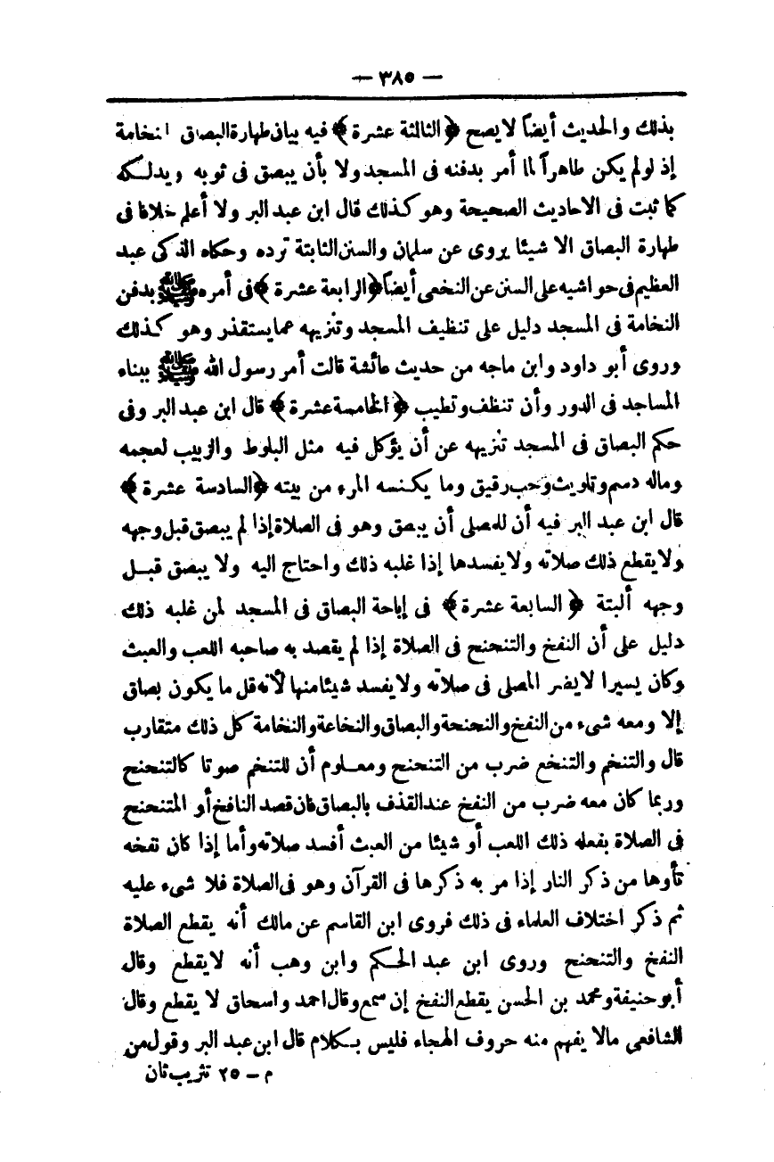 {الْخَامِسَةَ عَشْرَةَ} قَالَ ابْنُ عَبْدِ الْبَرِّ وَفِي حُكْمِ الْبُصَاقِ فِي الْمَسْجِدِ تَنْزِيهُهُ عَنْ أَنْ يُؤْكَلَ فِيهِ مِثْلُ الْبَلُّوطِ وَالزَّبِيبِ لِعُجْمِهِ وَمَا لَهُ دَسَمٌ وَتَلْوِيثٌ وَحَبٌّ رَقِيقٌ مَا يَكْنِسُهُ الْمَرْءُ مِنْ بَيْتِهِ {السَّادِسَةَ عَشْرَةَ} قَالَ ابْنُ عَبْدِ الْبَرِّ فِيهِ أَنَّ لِلْمُصَلِّي أَنْ يَبْصُقَ وَهُوَ فِي الصَّلَاةِ إذَا لَمْ يَبْصُقْ قِبَلَ وَجْهِهِ وَلَا يَقْطَعُ ذَلِكَ صَلَاتَهُ وَلَا يُفْسِدُهَا إذَا غَلَبَهُ ذَلِكَ وَاحْتَاجَ إلَيْهِ وَلَا يَبْصُقُ قِبَلَ وَجْهِهِ أَلْبَتَّةَ.