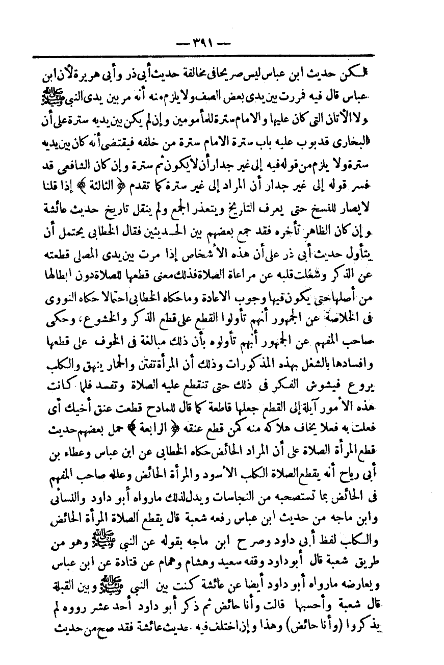 وَيَدُلُّ لِذَلِكَ مَا رَوَاهُ أَبُو دَاوُد وَالنَّسَائِيُّ وَابْنُ مَاجَهْ مِنْ حَدِيثِ ابْنِ عَبَّاسٍ رَفَعَهُ شُعْبَةُ قَالَ «يَقْطَعُ الصَّلَاةَ الْمَرْأَةُ الْحَائِضُ وَالْكَلْبُ» لَفْظُ أَبِي دَاوُد وَصَرَّحَ ابْنُ مَاجَهْ بِقَوْلِهِ عَنْ النَّبِيِّ - صَلَّى اللَّهُ عَلَيْهِ وَسَلَّمَ - وَهُوَ مِنْ طَرِيقِ شُعْبَةَ قَالَ أَبُو دَاوُد وَقَفَهُ سَعِيدٌ وَهِشَامٌ وَهَمَّامٌ عَنْ قَتَادَةَ عَنْ ابْنِ عَبَّاسٍ وَيُعَارِضُهُ مَا رَوَاهُ أَبُو دَاوُد أَيْضًا عَنْ عَائِشَةَ «كُنْت بَيْنَ النَّبِيِّ - صَلَّى اللَّهُ عَلَيْهِ وَسَلَّمَ - وَبَيْنَ الْقِبْلَةِ» قَالَ شُعْبَةُ وَأَحْسَبُهَا قَالَتْ وَأَنَا حَائِضٌ ثُمَّ ذَكَرَ أَبُو دَاوُد أَحَدَ عَشَرَ رَوَوْهُ لَمْ يَذْكُرُوا «وَأَنَا حَائِضٌ» وَهَذَا وَإِنْ اخْتَلَفَ فِيهِ حَدِيثُ عَائِشَةَ فَقَدْ صَحَّ مِنْ حَدِيثِ