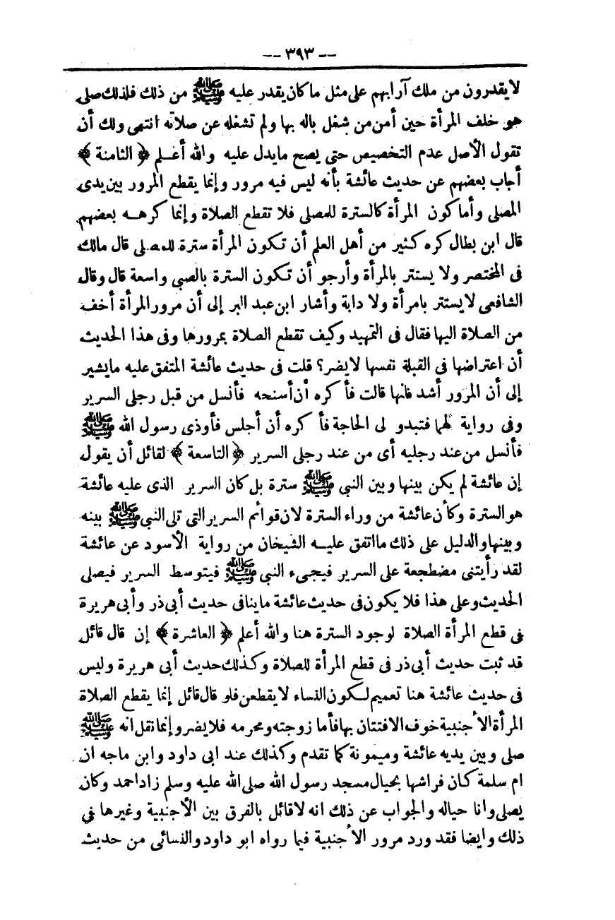 {التَّاسِعَةُ} لِقَائِلٍ أَنْ يَقُولَ إنَّ عَائِشَةَ لَمْ يَكُنْ بَيْنَهَا وَبَيْنَ النَّبِيِّ - صَلَّى اللَّهُ عَلَيْهِ وَسَلَّمَ - سُتْرَةٌ بَلْ كَانَ السَّرِيرُ الَّذِي عَلَيْهِ عَائِشَةُ هُوَ السُّتْرَةُ وَكَأَنَّ عَائِشَةَ مِنْ وَرَاءِ السُّتْرَةِ لِأَنَّ قَوَائِمَ السَّرِيرِ الَّتِي تَلِي النَّبِيَّ - صَلَّى اللَّهُ عَلَيْهِ وَسَلَّمَ - بَيْنَهُ وَبَيْنَهَا وَالدَّلِيلُ عَلَى ذَلِكَ مَا اتَّفَقَ عَلَيْهِ الشَّيْخَانِ مِنْ رِوَايَةِ الْأَسْوَدِ عَنْ عَائِشَةَ «لَقَدْ رَأَيْتنِي مُضْطَجِعَةً عَلَى السَّرِيرِ فَيَجِيءُ النَّبِيُّ - صَلَّى اللَّهُ عَلَيْهِ وَسَلَّمَ - فَيُتَوَسَّطُ السَّرِيرَ فَيُصَلِّي» الْحَدِيثَ وَعَلَى هَذَا فَلَا يَكُونُ فِي حَدِيثِ عَائِشَةَ مَا يُنَافِي حَدِيثَ أَبِي ذَرٍّ وَأَبِي هُرَيْرَةَ فِي قَطْعِ الْمَرْأَةِ الصَّلَاةَ لِوُجُودِ السُّتْرَةِ هُنَا وَاَللَّهُ أَعْلَمُ.