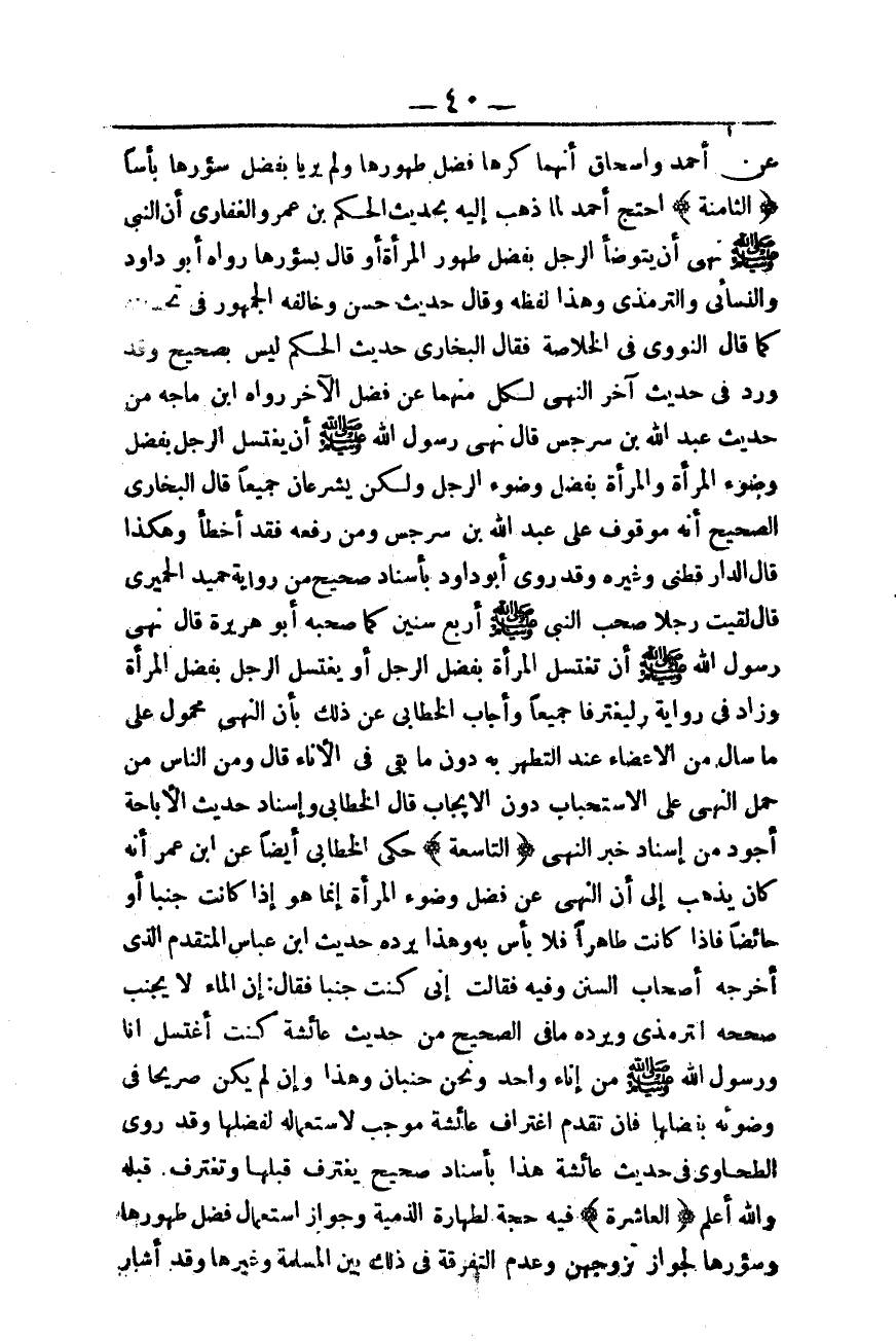 (الثَّامِنَةُ) احْتَجَّ أَحْمَدُ لِمَا ذَهَبَ إلَيْهِ بِحَدِيثِ الْحَكَمِ بْنِ عَمْرٍو الْغِفَارِيِّ «أَنَّ النَّبِيَّ - صَلَّى اللَّهُ عَلَيْهِ وَسَلَّمَ - نَهَى أَنْ يَتَوَضَّأَ الرَّجُلُ بِفَضْلِ طَهُورِ الْمَرْأَةِ أَوْ قَالَ بِسُؤْرِهَا» . رَوَاهُ أَبُو دَاوُد، وَالنَّسَائِيُّ، وَالتِّرْمِذِيُّ، وَهَذَا لَفْظُهُ وَقَالَ حَدِيثٌ حَسَنٌ وَخَالَفَهُ الْجُمْهُورُ فِي تَحْسِينِهِ كَمَا قَالَ النَّوَوِيُّ فِي الْخُلَاصَةِ فَقَالَ الْبُخَارِيُّ: حَدِيثُ الْحَكَمِ لَيْسَ بِصَحِيحٍ، وَقَدْ وَرَدَ فِي حَدِيثٍ آخَرَ النَّهْيُ لِكُلٍّ مِنْهُمَا عَنْ فَضْلِ الْآخَرِ رَوَاهُ ابْنُ مَاجَهْ مِنْ حَدِيثِ عَبْدِ اللَّهِ بْنِ سَرْجِسَ قَالَ: «نَهَى رَسُولُ اللَّهِ - صَلَّى اللَّهُ عَلَيْهِ وَسَلَّمَ - أَنْ يَغْتَسِلَ الرَّجُلُ بِفَضْلِ وُضُوءِ الْمَرْأَةِ، وَالْمَرْأَةُ بِفَضْلِ وُضُوءِ الرَّجُلِ وَلَكِنْ يَشْرَعَانِ جَمِيعًا» . قَالَ الْبُخَارِيُّ الصَّحِيحُ أَنَّهُ مَوْقُوفٌ عَلَى عَبْدِ اللَّهِ بْنِ سَرْجِسَ وَمَنْ رَفَعَهُ فَقَدْ أَخْطَأَ وَهَكَذَا قَالَ الدَّارَقُطْنِيُّ وَغَيْرُهُ، وَقَدْ رَوَى أَبُو دَاوُد بِإِسْنَادٍ صَحِيحٍ مِنْ رِوَايَةِ حُمَيْدٍ الْحِمْيَرِيِّ قَالَ: لَقِيت رَجُلًا صَحِبَ النَّبِيَّ - صَلَّى اللَّهُ عَلَيْهِ وَسَلَّمَ - أَرْبَعَ سِنِينَ كَمَا صَحِبَهُ أَبُو هُرَيْرَةَ قَالَ «نَهَى رَسُولُ اللَّهِ - صَلَّى اللَّهُ عَلَيْهِ وَسَلَّمَ - أَنْ تَغْتَسِلَ الْمَرْأَةُ بِفَضْلِ الرَّجُلِ أَوْ يَغْتَسِلَ الرَّجُلُ بِفَضْلِ الْمَرْأَةِ» . وَزَادَ فِي رِوَايَةٍ «لِيَغْتَرِفَا جَمِيعًا» وَأَجَابَ الْخَطَّابِيُّ عَنْ ذَلِكَ بِأَنَّ النَّهْيَ مَحْمُولٌ عَلَى مَا سَالَ مِنْ الْأَعْضَاءِ عِنْدَ التَّطَهُّرِ بِهِ دُونَ مَا بَقِيَ فِي الْإِنَاءِ قَالَ: وَمِنْ النَّاسِ مَنْ حَمَلَ النَّهْيَ عَلَى الِاسْتِحْبَابِ دُونَ الْإِيجَابِ قَالَ الْخَطَّابِيُّ وَإِسْنَادُ حَدِيثِ الْإِبَاحَةِ أَجْوَدُ مِنْ إسْنَادِ خَبَرِ النَّهْيِ.