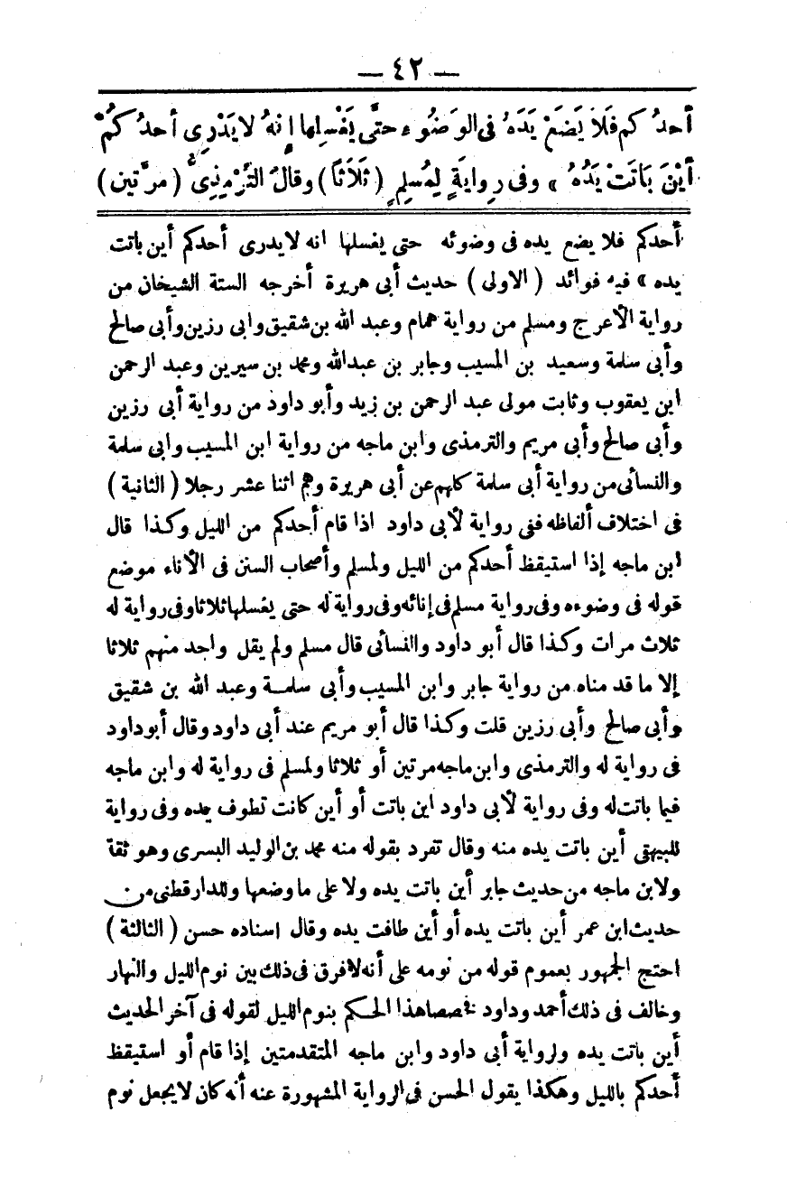 أَحَدُكُمْ فَلَا يَضَعْ يَدَهُ فِي الْوُضُوءِ حَتَّى يَغْسِلَهَا إنَّهُ لَا يَدْرِي أَحَدُكُمْ أَيْنَ بَاتَتْ يَدُهُ» وَفِي رِوَايَةٍ لِمُسْلِمٍ «ثَلَاثًا» وَقَالَ التِّرْمِذِيُّ «مَرَّتَيْنِ