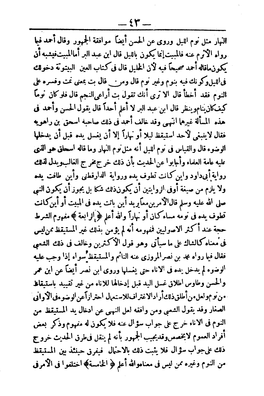 وَمَا قَالَهُ إِسْحَاقُ هُوَ الَّذِي عَلَيْهِ عَامَّةُ الْعُلَمَاءِ وَأَجَابُوا عَنْ الْحَدِيثِ بِأَنَّ ذَلِكَ خَرَجَ مَخْرَجَ الْغَالِبِ وَيَدُلُّ لِذَلِكَ رِوَايَةُ أَبِي دَاوُد «وَأَيْنَ كَانَتْ تَطُوفُ يَدُهُ» وَرِوَايَةُ الدَّارَقُطْنِيِّ «وَأَيْنَ طَافَتْ يَدُهُ» وَلَا يَلْزَمُ مِنْ صِيغَةٍ أَوْ فِي الرِّوَايَتَيْنِ أَنْ يَكُونَ ذَلِكَ شَكًّا بَلْ يَجُوزُ أَنْ يَكُونَ النَّبِيُّ - صَلَّى اللَّهُ عَلَيْهِ وَسَلَّمَ - قَالَ الْأَمْرَيْنِ مَعًا يُرِيدُ أَيْنَ بَاتَتْ يَدُهُ فِي الْمَبِيتِ أَوْ أَيْنَ كَانَتْ تَطُوفُ يَدُهُ فِي نَوْمِهِ مَسَاءً كَانَ أَوْ نَهَارًا وَاَللَّهُ أَعْلَمُ.