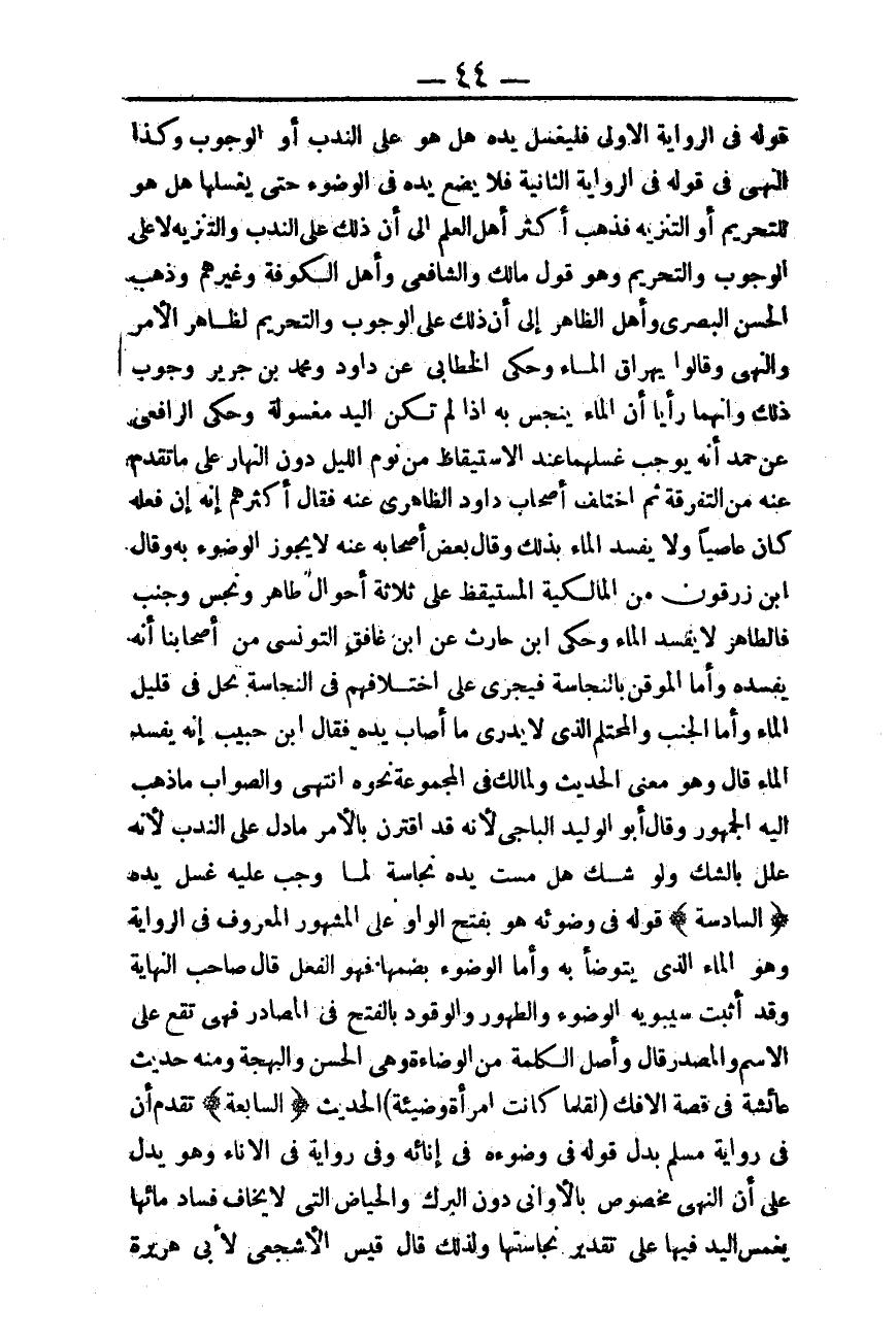 ـــــــــــــــــــــــــــــQقَوْلِهِ فِي الرِّوَايَةِ الْأُولَى فَلْيَغْسِلْ يَدَهُ هَلْ هُوَ عَلَى النَّدْبِ أَوْ الْوُجُوبِ، وَكَذَا النَّهْيُ فِي قَوْلِهِ فِي الرِّوَايَةِ الثَّانِيَةِ: فَلَا يَضَعْ يَدَهُ فِي الْوُضُوءِ حَتَّى يَغْسِلَهَا هَلْ هُوَ لِلتَّحْرِيمِ أَوْ التَّنْزِيهِ فَذَهَبَ أَكْثَرُ أَهْلِ الْعِلْمِ إلَى أَنَّ ذَلِكَ عَلَى النَّدْبِ، وَالتَّنْزِيهِ لَا عَلَى الْوُجُوبِ، وَالتَّحْرِيمِ، وَهُوَ قَوْلُ مَالِكٍ وَالشَّافِعِيِّ وَأَهْلُ الْكُوفَةِ وَغَيْرِهِمْ وَذَهَبَ الْحَسَنُ الْبَصْرِيُّ وَأَهْلُ الظَّاهِرِ إلَى أَنَّ ذَلِكَ عَلَى الْوُجُوبِ، وَالتَّحْرِيمِ لِظَاهِرِ الْأَمْرِ، وَالنَّهْيِ.