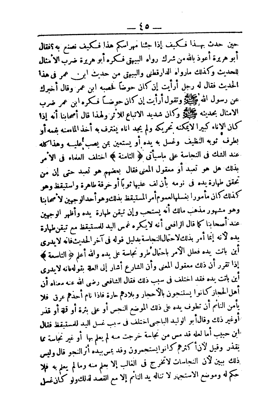 (التَّاسِعَةُ) إذَا تَقَرَّرَ أَنَّ ذَلِكَ مَعْقُولُ الْمَعْنَى، وَأَنَّ الشَّارِعَ أَشَارَ إلَى الْعِلَّةِ بِقَوْلِهِ: فَإِنَّهُ لَا يَدْرِي أَيْنَ بَاتَتْ يَدُهُ فَقَدْ اُخْتُلِفَ فِي سَبَبِ ذَلِكَ فَقَالَ الشَّافِعِيُّ: - رَضِيَ اللَّهُ عَنْهُ - مَعْنَاهُ أَنَّ أَهْلَ الْحِجَازِ كَانُوا يَسْتَنْجُونَ بِالْأَحْجَارِ وَبِلَادُهُمْ حَارَّةٌ، فَإِذَا نَامَ أَحَدُهُمْ عَرِقَ فَلَا يَأْمَنُ النَّائِمُ أَنْ تَطُوفَ يَدُهُ عَلَى ذَلِكَ الْمَوْضِعِ النَّجِسِ أَوْ عَلَى بَثْرَةٍ أَوْ قَمْلَةٍ أَوْ قَذِرٍ أَوْ غَيْرِ ذَلِكَ.