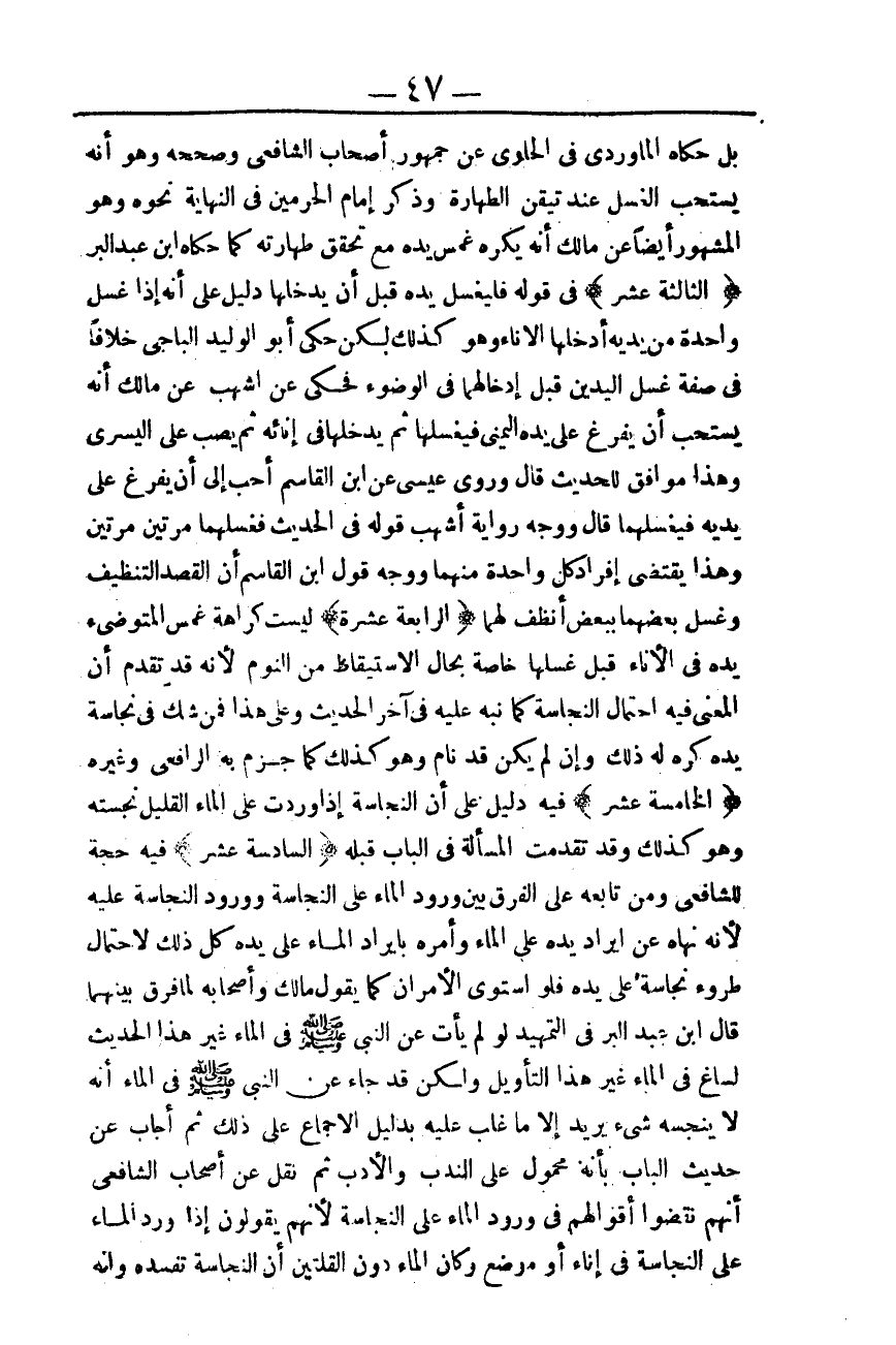 ـــــــــــــــــــــــــــــQبَلْ حَكَاهُ الْمَاوَرْدِيُّ فِي الْحَاوِي عَنْ جُمْهُورِ أَصْحَابِ الشَّافِعِيِّ وَصَحَّحَهُ، وَهُوَ أَنَّهُ يُسْتَحَبُّ الْغَسْلُ عِنْدَ تَيَقُّنِ الطَّهَارَةِ وَذَكَرَ إمَامُ الْحَرَمَيْنِ فِي النِّهَايَةِ نَحْوَهُ، وَهُوَ الْمَشْهُورُ أَيْضًا عَنْ مَالِكٍ أَنَّهُ يُكْرَهُ غَمْسُ يَدِهِ مَعَ تَحَقُّقِ طَهَارَتِهِ كَمَا حَكَاهُ ابْنُ عَبْدِ الْبَرِّ.