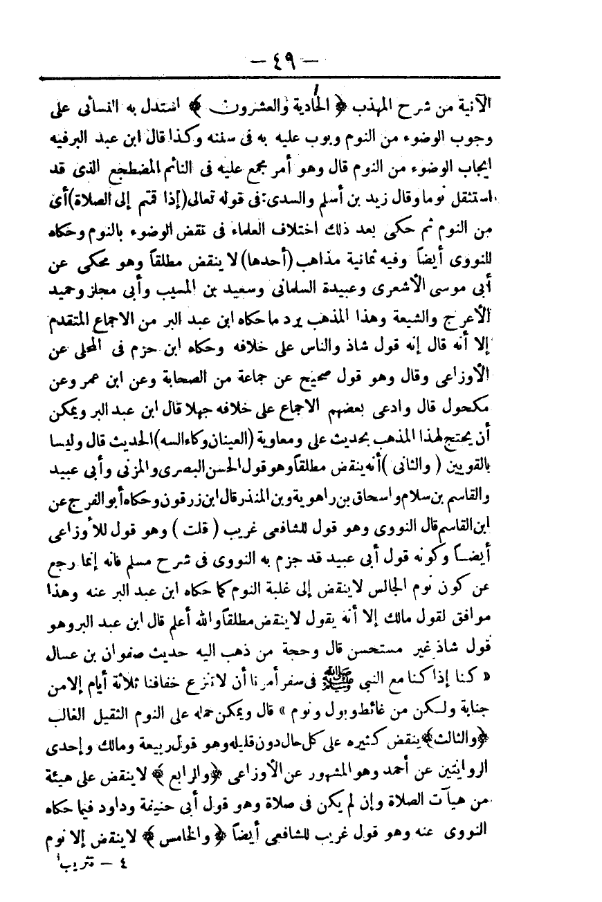 قَالَ ابْنُ عَبْدِ الْبَرِّ، وَهُوَ قَوْلٌ شَاذٌّ غَيْرُ مُسْتَحْسَنٍ قَالَ وَحُجَّةُ مَنْ ذَهَبَ إلَيْهِ حَدِيثُ صَفْوَانَ بْنِ عَسَّالٍ «كُنَّا إذَا كُنَّا مَعَ النَّبِيِّ - صَلَّى اللَّهُ عَلَيْهِ وَسَلَّمَ - فِي سَفَرٍ أَمَرَنَا أَنْ لَا نَنْزِعَ خِفَافَنَا ثَلَاثَةَ أَيَّامٍ إلَّا مِنْ جَنَابَةٍ وَلَكِنْ مِنْ غَائِطٍ وَبَوْلٍ وَنَوْمٍ» قَالَ: وَيُمْكِنُ حَمْلُهُ عَلَى النَّوْمِ الثَّقِيلِ الْغَالِبِ.