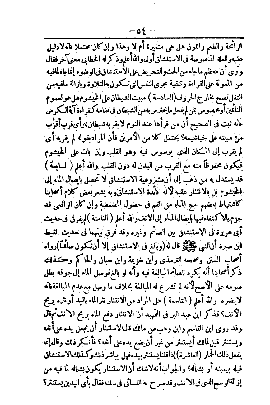 ـــــــــــــــــــــــــــــQالرَّائِحَةُ، وَالطَّعْمُ، وَاللَّوْنُ هَلْ هِيَ مُتَغَيِّرَةٌ أَمْ لَا، وَهَذَا وَإِنْ كَانَ مُحْتَمَلًا فَإِنَّهُ لَا دَلِيلَ عَلَيْهِ، وَالْعِلَّةُ الْمَنْصُوصَةُ فِي الِاسْتِنْشَاقِ أَوْلَى وَاَللَّهُ أَعْلَمُ.