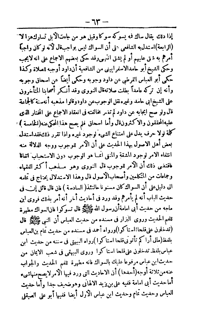 (الرَّابِعَةُ) اسْتَدَلَّ بِهِ الشَّافِعِيُّ عَلَى أَنَّ السِّوَاكَ لَيْسَ بِوَاجِبٍ قَالَ لِأَنَّهُ لَوْ كَانَ وَاجِبًا أَمَرَهُمْ بِهِ شَقَّ عَلَيْهِمْ أَوْ لَمْ يَشُقَّ انْتَهَى.