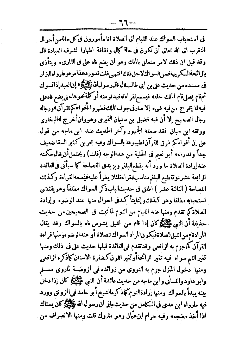 ـــــــــــــــــــــــــــــQفِي اسْتِحْبَابِ السِّوَاكِ عِنْدَ الْقِيَامِ إلَى الصَّلَاةِ أَنَّا مَأْمُورُونَ فِي كُلِّ حَالَةٍ مِنْ أَحْوَالِ التَّقَرُّبِ إلَى اللَّهِ تَعَالَى أَنْ نَكُونَ فِي حَالَةِ كَمَالٍ وَنَظَافَةٍ إظْهَارًا لِشَرَفِ الْعِبَادَةِ قَالَ: وَقَدْ قِيلَ: إنَّ ذَلِكَ لِأَمْرٍ مُتَعَلِّقٍ بِالْمَلَكِ وَهُوَ أَنْ يَضَعَ فَاهُ عَلَى فِي الْقَارِئِ وَيَتَأَذَّى بِالرَّائِحَةِ الْكَرِيهَةِ فَسُنَّ السِّوَاكُ لِأَجْلِ ذَلِكَ انْتَهَى قُلْت قَدْ وَرَدَ هَذَا مَرْفُوعًا رَوَاهُ الْبَزَّارُ فِي مُسْنَدِهِ مِنْ حَدِيثِ عَلِيِّ بْنِ أَبِي طَالِبٍ قَالَ قَالَ رَسُولُ اللَّهِ - صَلَّى اللَّهُ عَلَيْهِ وَسَلَّمَ -: «إنَّ الْعَبْدَ إذَا تَسَوَّكَ ثُمَّ قَامَ يُصَلِّي قَامَ الْمَلَكُ خَلْفَهُ فَيَسْمَعُ لِقِرَاءَتِهِ فَيَدْنُو مِنْهُ أَوْ كَلِمَةً نَحْوَهَا حَتَّى يَضَعَ فَاهُ عَلَى فِيهِ فَمَا يَخْرُجُ مِنْ فِيهِ شَيْءٌ إلَّا صَارَ فِي جَوْفِ الْمَلَكِ فَطَهِّرُوا أَفْوَاهَكُمْ لِلْقُرْآنِ» وَرِجَالُهُ رِجَالُ الصَّحِيحِ إلَّا أَنَّ فِيهِ فُضَيْلٍ بْنَ سُلَيْمَانَ النُّمَيْرِيَّ وَهُوَ وَإِنْ أَخْرَجَ لَهُ الْبُخَارِيُّ وَوَثَّقَهُ ابْنُ حِبَّانَ فَقَدْ ضَعَّفَهُ الْجُمْهُورُ وَآخِرُ الْحَدِيثِ عِنْدَ ابْنِ مَاجَهْ مِنْ قَوْلِ عَلِيٍّ إنَّ أَفْوَاهَكُمْ طُرُقٌ لِلْقُرْآنِ فَطَيِّبُوهَا بِالسِّوَاكِ وَفِيهِ بَحْرُ بْنُ كَثِيرٍ السَّقَّا ضَعِيفٌ جِدًّا.