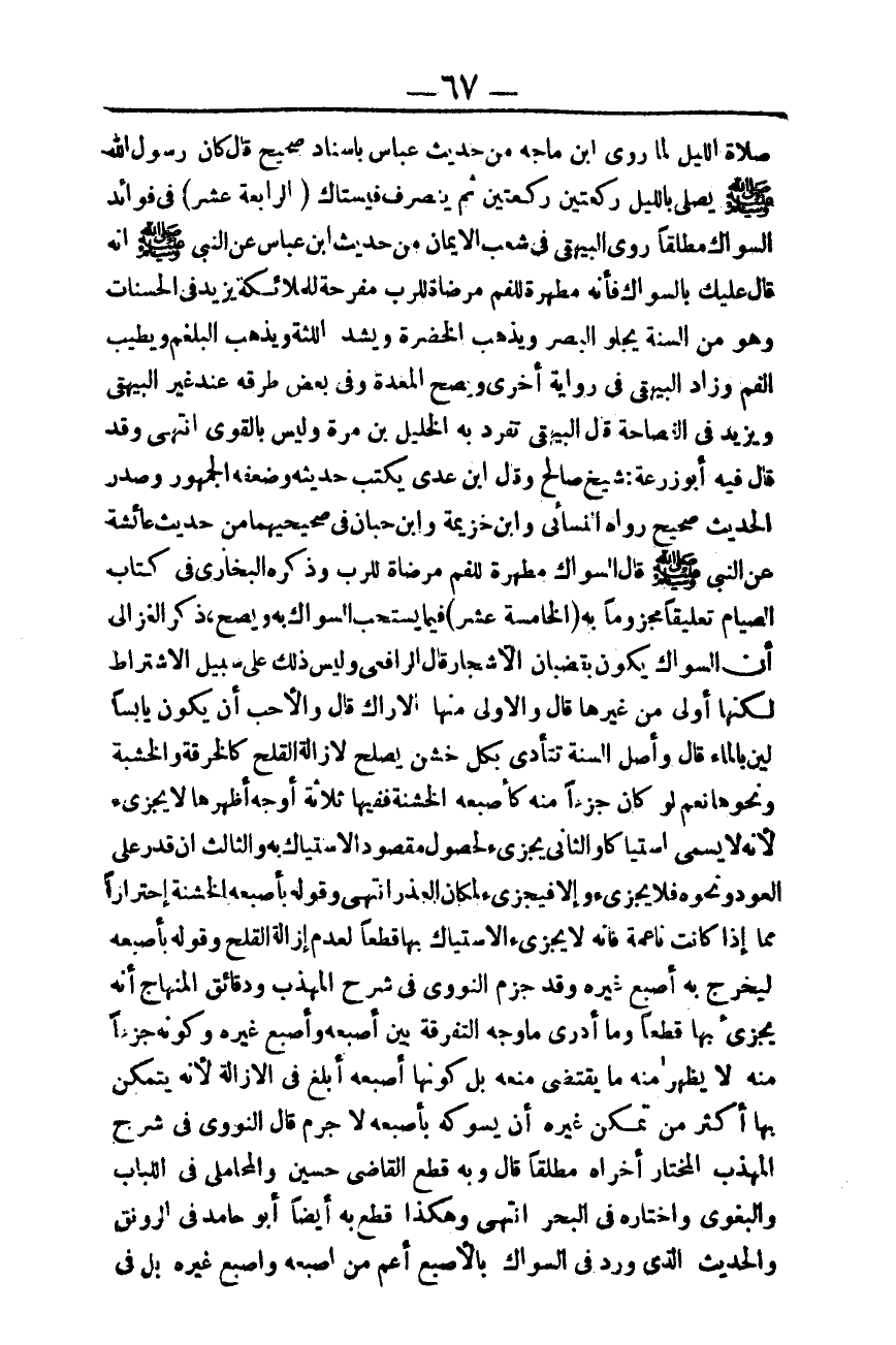 ـــــــــــــــــــــــــــــQصَلَاةُ اللَّيْلِ لِمَا رَوَى ابْنُ مَاجَهْ مِنْ حَدِيثِ عَبَّاسٍ بِإِسْنَادٍ صَحِيحٍ قَالَ «كَانَ رَسُولُ اللَّهِ - صَلَّى اللَّهُ عَلَيْهِ وَسَلَّمَ - يُصَلِّي بِاللَّيْلِ رَكْعَتَيْنِ رَكْعَتَيْنِ ثُمَّ يَنْصَرِفُ فَيَسْتَاكُ» .