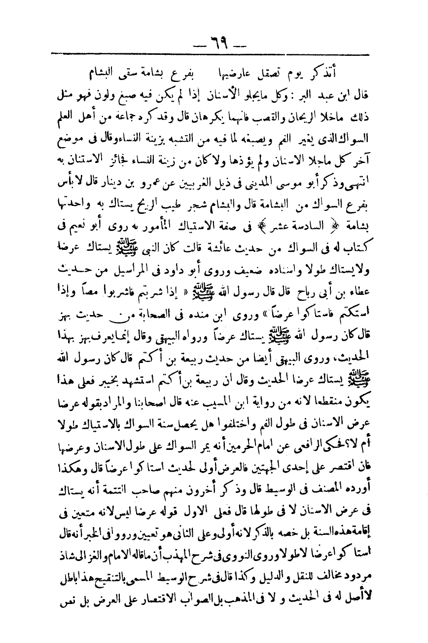 وَقَالَ ابْنُ رَبِيعَةَ بْنِ أَكْتَمَ اُسْتُشْهِدَ بِخَيْبَرَ فَعَلَى هَذَا يَكُونُ مُنْقَطِعًا؛ لِأَنَّهُ مِنْ رِوَايَةِ ابْنِ الْمُسَيِّبِ عَنْهُ قَالَ أَصْحَابُنَا: وَالْمُرَادُ بِقَوْلِهِ عَرْضًا عَرْضُ الْأَسْنَانِ فِي طُولِ الْفَمِ وَاخْتَلَفُوا هَلْ يَحْصُلُ سُنَّةُ السِّوَاكِ بِالِاسْتِيَاكِ طُولًا أَمْ لَا؟ فَحَكَى الرَّافِعِيُّ عَنْ إمَامِ الْحَرَمَيْنِ أَنَّهُ يُمِرُّ السِّوَاكَ عَلَى طُولِ الْأَسْنَانِ وَعَرْضِهَا فَإِنْ اقْتَصَرَ عَلَى إحْدَى الْجِهَتَيْنِ فَالْعَرْضُ أَوْلَى لِحَدِيثِ «اسْتَاكُوا عَرْضًا» قَالَ وَهَكَذَا أَوْرَدَهُ الْمُصَنِّفُ فِي الْوَسِيطِ قَالَ وَذَكَرَ آخَرُونَ مِنْهُمْ صَاحِبُ التَّتِمَّةِ أَنَّهُ يَسْتَاكُ فِي عَرْضِ الْأَسْنَانِ لَا فِي طُولِهَا قَالَ فَعَلَى الْأَوَّلِ قَوْلُهُ عَرْضًا لَيْسَ؛ لِأَنَّهُ مُتَعَيِّنٌ فِي إقَامَةِ هَذِهِ السُّنَّةِ بَلْ خَصَّهُ بِالذِّكْرِ؛ لِأَنَّهُ أَوْلَى وَعَلَى الثَّانِي هُوَ تَعْيِينٌ وَرَوَوْا فِي الْخَبَرِ أَنَّهُ قَالَ: اسْتَاكُوا عَرْضًا لَا طُولًا وَرَوَى النَّوَوِيُّ فِي شَرْحِ الْمُهَذَّبِ أَنَّ مَا قَالَهُ الْإِمَامُ وَالْغَزَالِيُّ شَاذٌّ مَرْدُودٌ مُخَالِفٌ لِلنَّقْلِ، وَالدَّلِيلِ.
