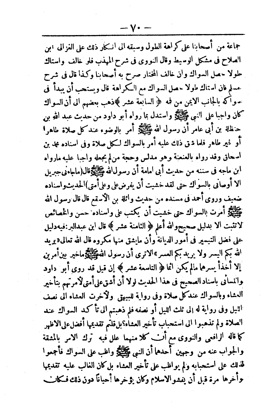(السَّابِعَةَ عَشْرَ) ذَهَبَ بَعْضُهُمْ إلَى أَنَّ السِّوَاكَ كَانَ وَاجِبًا عَلَى النَّبِيِّ - صَلَّى اللَّهُ عَلَيْهِ وَسَلَّمَ - وَاسْتَدَلَّ بِمَا رَوَاهُ أَبُو دَاوُد مِنْ حَدِيثِ عَبْدِ اللَّهِ بْنِ حَنْظَلَةَ بْنِ أَبِي عَامِرٍ «أَنَّ رَسُولَ اللَّهِ - صَلَّى اللَّهُ عَلَيْهِ وَسَلَّمَ - أُمِرَ بِالْوُضُوءِ عِنْدَ كُلِّ صَلَاةٍ طَاهِرًا أَوْ غَيْرَ طَاهِرٍ فَلَمَّا شَقَّ ذَلِكَ عَلَيْهِ أُمِرَ بِالسِّوَاكِ لِكُلِّ صَلَاةٍ» وَفِي إسْنَادِهِ مُحَمَّدُ بْنُ إِسْحَاقَ، وَقَدْ رَوَاهُ بِالْعَنْعَنَةِ، وَهُوَ مُدَلِّسٌ.