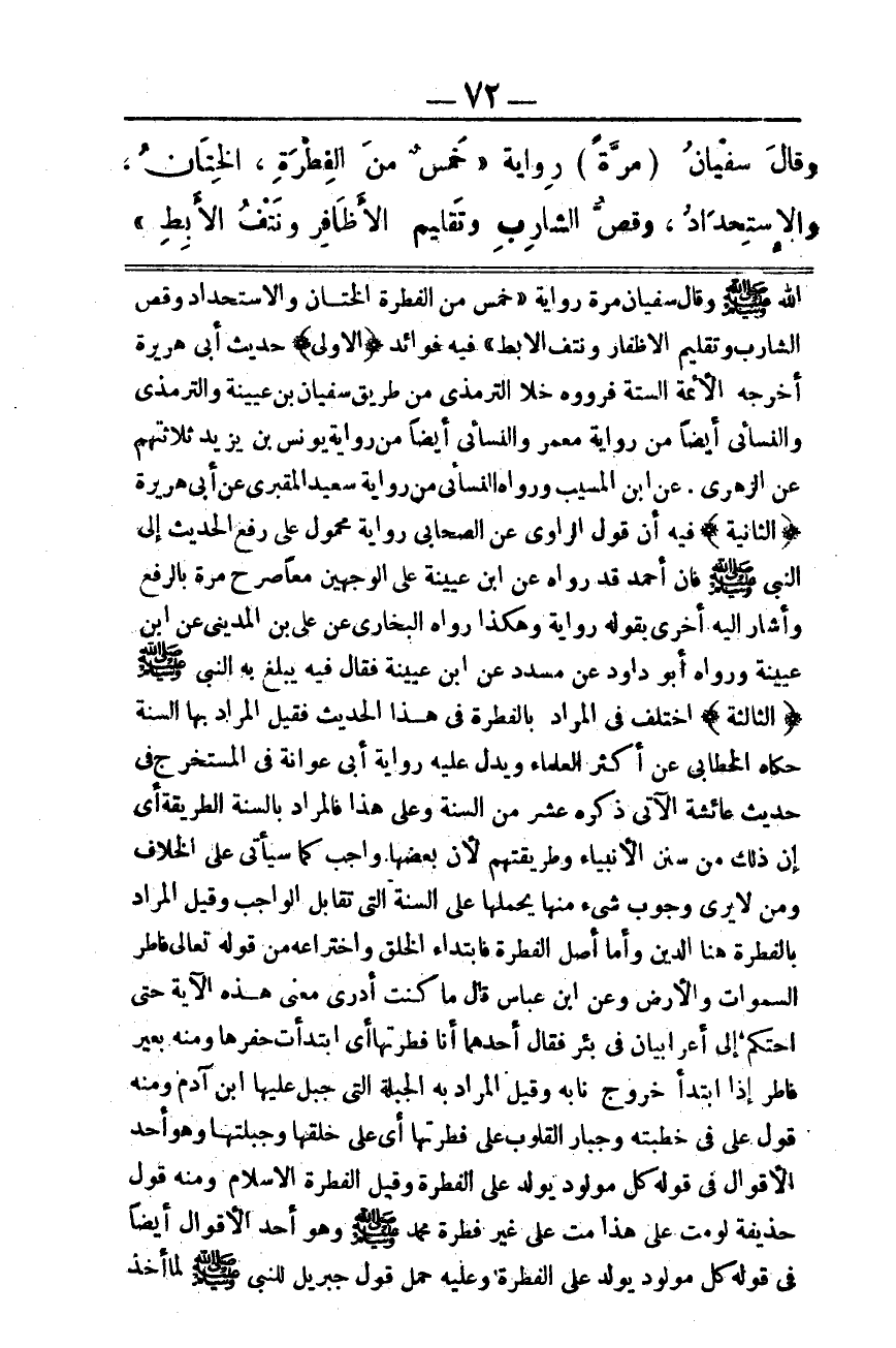 ـــــــــــــــــــــــــــــQاللَّهِ - صَلَّى اللَّهُ عَلَيْهِ وَسَلَّمَ - وَقَالَ سُفْيَانُ مَرَّةً رِوَايَةَ «خَمْسٌ مِنْ الْفِطْرَةِ: الْخِتَانُ، وَالِاسْتِحْدَادُ وَقَصُّ الشَّارِبِ وَتَقْلِيمُ الْأَظْفَارِ وَنَتْفُ الْإِبِطِ» فِيهِ فَوَائِدُ: