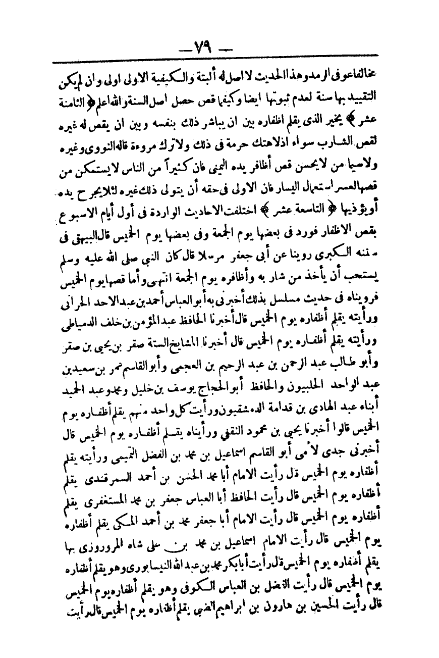 قَالَ أَخْبَرَنِي جَدِّي لِأُمِّي أَبُو الْقَاسِمِ إسْمَاعِيلُ بْنُ مُحَمَّدِ بْنِ الْفَضْلِ التَّمِيمِيُّ وَرَأَيْته يُقَلِّمُ أَظْفَارَهُ يَوْمَ الْخَمِيسِ قَالَ رَأَيْت الْإِمَامَ أَبَا مُحَمَّدٍ الْحَسَنَ بْنَ أَحْمَدَ السَّمَرْقَنْدِيَّ يُقَلِّمُ أَظْفَارَهُ يَوْمَ الْخَمِيسِ قَالَ رَأَيْت الْحَافِظَ أَبَا الْعَبَّاسِ جَعْفَرَ بْنَ مُحَمَّدٍ الْمُسْتَغْفِرِيَّ يُقَلِّمُ أَظْفَارَهُ يَوْمَ الْخَمِيسِ قَالَ رَأَيْت الْإِمَامَ أَبَا جَعْفَرٍ مُحَمَّدَ بْنَ أَحْمَدَ الْمَكِّيَّ يُقَلِّمُ أَظْفَارَهُ يَوْمَ الْخَمِيسِ قَالَ رَأَيْت الْإِمَامَ إسْمَاعِيلَ بْنَ مُحَمَّدِ بْنِ عَلِيِّ شَاهْ الْمَرْوَرُذِيَّ بِهَا يُقَلِّمُ أَظْفَارَهُ يَوْمَ الْخَمِيسِ قَالَ رَأَيْت أَبَا بَكْرٍ مُحَمَّدَ بْنَ عَبْدِ اللَّهِ النَّيْسَابُورِيَّ، وَهُوَ يُقَلِّمُ أَظْفَارَهُ يَوْمَ الْخَمِيسِ قَالَ رَأَيْت الْفَضْلَ بْنَ الْعَبَّاسِ الْكُوفِيَّ، وَهُوَ يُقَلِّمُ أَظْفَارَهُ يَوْمَ الْخَمِيسِ قَالَ رَأَيْت الْحُسَيْنَ بْنَ هَارُونَ بْنِ إبْرَاهِيمَ الضَّبِّيَّ يُقَلِّمُ أَظْفَارَهُ يَوْمَ الْخَمِيسِ قَالَ رَأَيْت