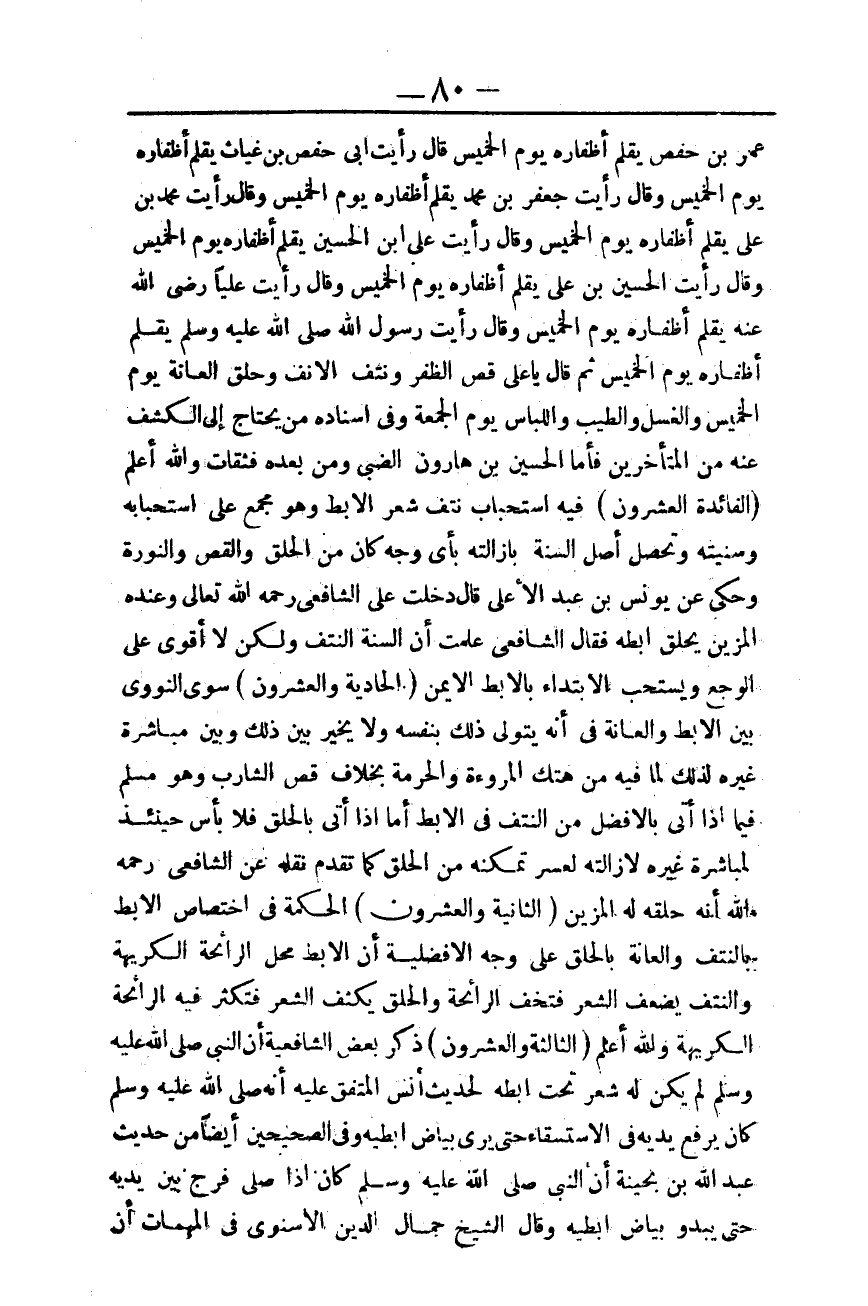 ـــــــــــــــــــــــــــــQعُمَرَ بْنَ حَفْصٍ يُقَلِّمُ أَظْفَارَهُ يَوْمَ الْخَمِيسِ قَالَ رَأَيْت أَبِي حَفْصَ بْنَ غِيَاثٍ يُقَلِّمُ أَظْفَارَهُ يَوْمَ الْخَمِيسِ وَقَالَ رَأَيْت جَعْفَرَ بْنَ مُحَمَّدٍ يُقَلِّمُ أَظْفَارَهُ يَوْمَ الْخَمِيسِ وَقَالَ رَأَيْت مُحَمَّدَ بْنَ عَلِيٍّ يُقَلِّمُ أَظْفَارَهُ يَوْمَ الْخَمِيسِ وَقَالَ رَأَيْت عَلِيَّ بْنَ الْحُسَيْنِ يُقَلِّمُ أَظْفَارَهُ يَوْمَ الْخَمِيسِ وَقَالَ رَأَيْت الْحُسَيْنَ بْنَ عَلِيٍّ يُقَلِّمُ أَظْفَارَهُ يَوْمَ الْخَمِيسِ وَقَالَ رَأَيْت عَلِيًّا - رَضِيَ اللَّهُ عَنْهُ - يُقَلِّمُ أَظْفَارَهُ يَوْمَ الْخَمِيسِ وَقَالَ «رَأَيْت رَسُولَ اللَّهِ - صَلَّى اللَّهُ عَلَيْهِ وَسَلَّمَ - يُقَلِّمُ أَظْفَارَهُ يَوْمَ الْخَمِيسِ ثُمَّ قَالَ: يَا عَلِيُّ قَصُّ الظُّفْرِ وَنَتْفُ الْأَنْفِ وَحَلْقُ الْعَانَةِ يَوْمَ الْخَمِيسِ، وَالْغُسْلُ، وَالطِّيبُ، وَاللِّبَاسُ يَوْمَ الْجُمُعَةِ» .