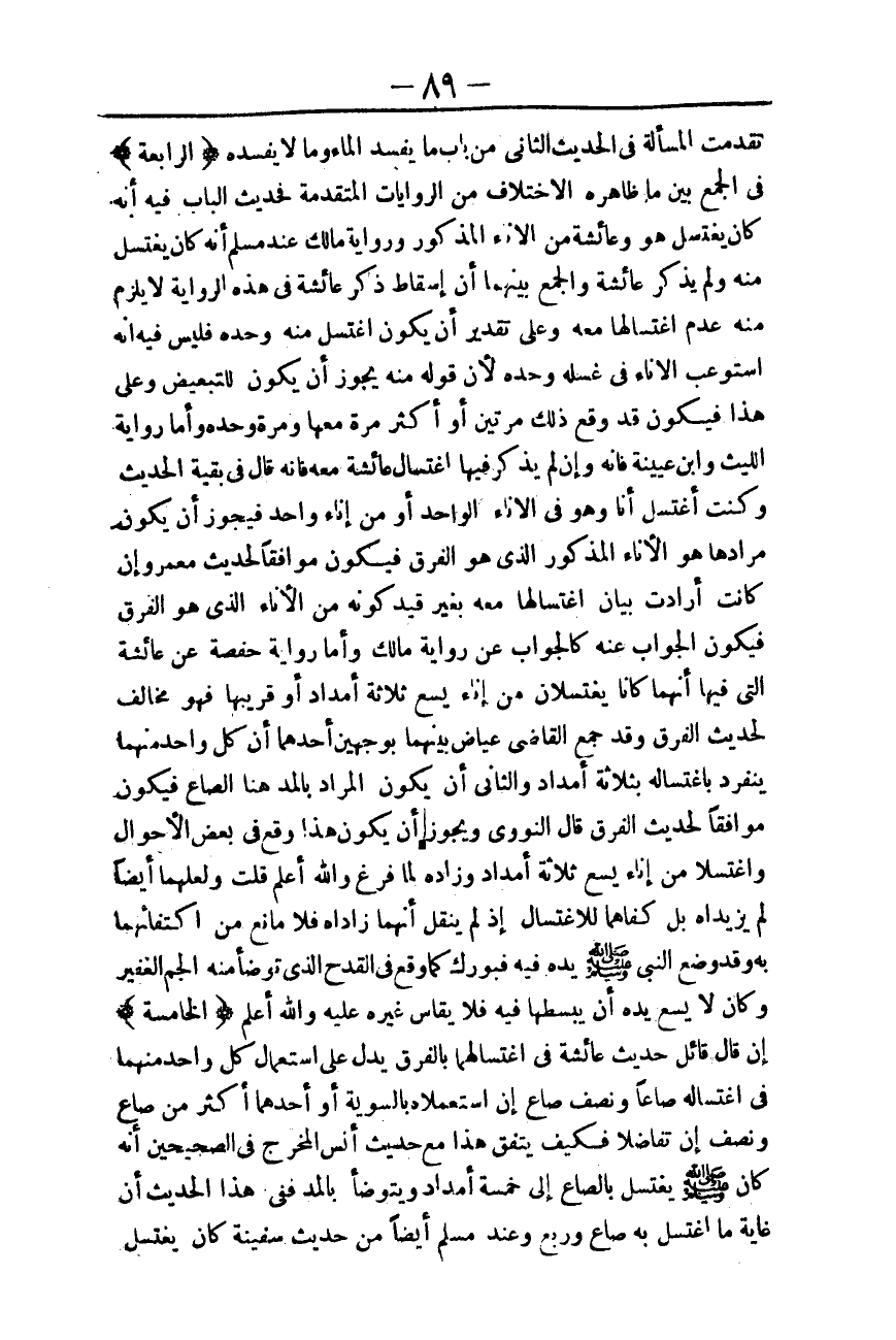 (الْخَامِسَةُ) إنْ قَالَ قَائِلٌ حَدِيثُ عَائِشَةَ فِي اغْتِسَالِهِمَا بِالْفَرَقِ يَدُلُّ عَلَى اسْتِعْمَالِ كُلِّ وَاحِدٍ مِنْهُمَا فِي اغْتِسَالِهِ صَاعًا وَنِصْفَ صَاعٍ إنْ اسْتَعْمَلَاهُ بِالسَّوِيَّةِ أَوْ أَحَدُهُمَا أَكْثَرَ مِنْ صَاعٍ وَنِصْفٍ إنْ تَفَاضَلَا فَكَيْفَ يَتَّفِقُ هَذَا مَعَ حَدِيثِ أَنَسٍ الْمُخَرَّجُ فِي الصَّحِيحَيْنِ «أَنَّهُ كَانَ - صَلَّى اللَّهُ عَلَيْهِ وَسَلَّمَ - يَغْتَسِلُ بِالصَّاعِ إلَى خَمْسَةِ أَمْدَادٍ وَيَتَوَضَّأُ بِالْمُدِّ» فَفِي هَذَا الْحَدِيثِ أَنَّ غَايَةَ مَا اغْتَسَلَ بِهِ صَاعٌ وَرُبُعٌ وَعِنْدَ مُسْلِمٍ أَيْضًا مِنْ حَدِيثِ سَفِينَةَ «كَانَ يَغْتَسِلُ