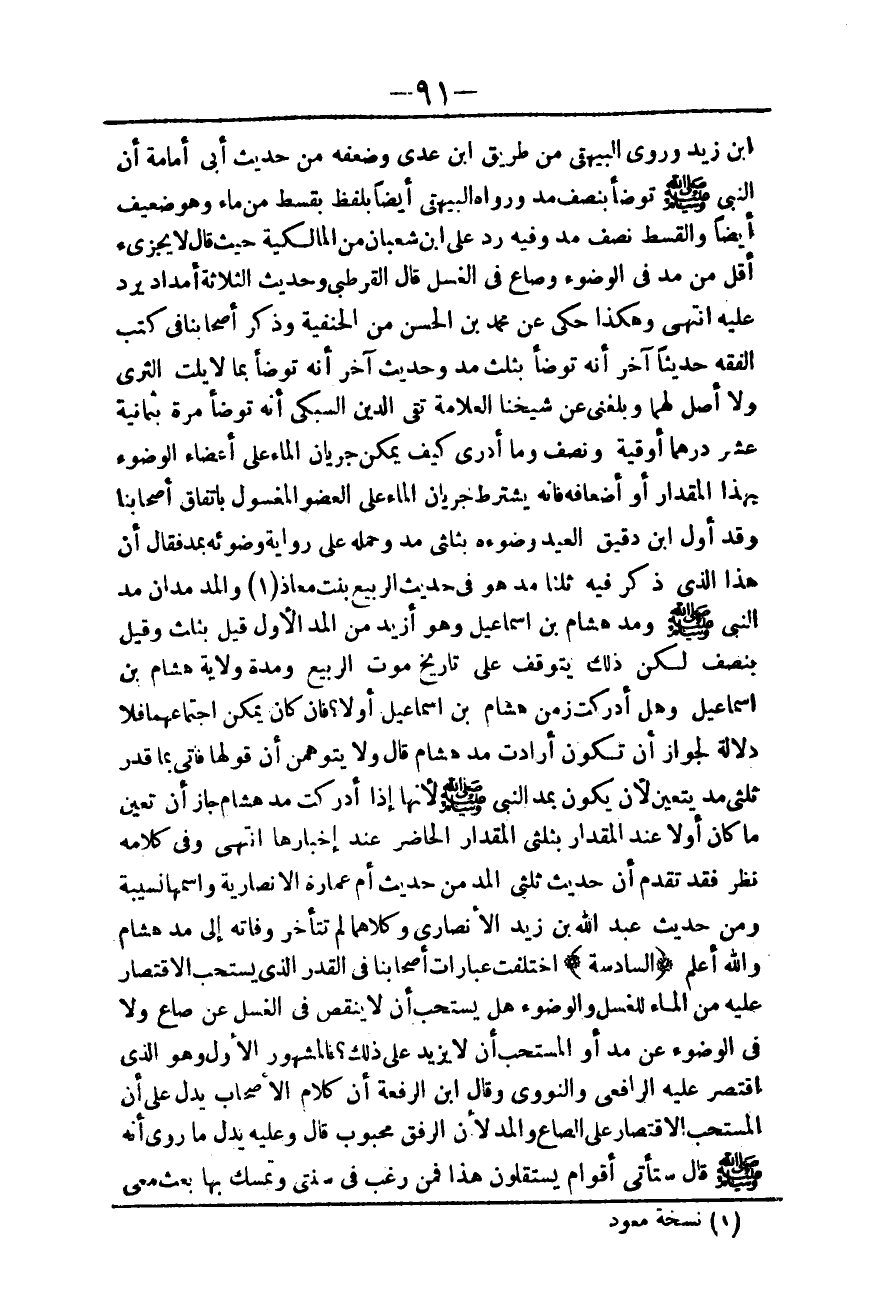 وَهَكَذَا حَكَى عَنْ مُحَمَّدِ بْنِ الْحَسَنِ مِنْ الْحَنَفِيَّةِ وَذَكَرَ أَصْحَابُنَا فِي كُتُبِ الْفِقْهِ حَدِيثًا آخَرَ أَنَّهُ تَوَضَّأَ بِثُلُثِ مُدِّ وَحَدِيثٌ آخَرُ أَنَّهُ تَوَضَّأَ بِمَا لَا يَلُتُّ الثَّرَى وَلَا أَصْلَ لَهُمَا وَبَلَغَنِي عَنْ شَيْخِنَا الْعَلَّامَةِ تَقِيِّ الدِّينِ السُّبْكِيّ أَنَّهُ تَوَضَّأَ مَرَّةً بِثَمَانِيَةَ عَشَرَ دِرْهَمًا أُوقِيَّةٍ وَنِصْفٍ وَمَا أَدْرِي كَيْفَ يُمْكِنُ جَرَيَانُ الْمَاءِ عَلَى أَعْضَاءِ الْوُضُوءِ بِهَذَا الْمِقْدَارِ أَوْ أَضْعَافِهِ فَإِنَّهُ يُشْتَرَطُ جَرَيَانُ الْمَاءِ عَلَى الْعُضْوِ الْمَغْسُولِ بِاتِّفَاقِ أَصْحَابِنَا، وَقَدْ أَوَّلَ ابْنُ دَقِيقِ الْعِيدِ وُضُوءَهُ بِثُلُثَيْ مُدٍّ وَحَمَلَهُ عَلَى رِوَايَةِ وُضُوئِهِ بِمُدٍّ فَقَالَ: إنَّ هَذَا الَّذِي ذُكِرَ فِيهِ ثُلُثَا مُدٍّ هُوَ فِي حَدِيثِ الرُّبَيِّعِ بِنْتِ مُعَاذٍ.