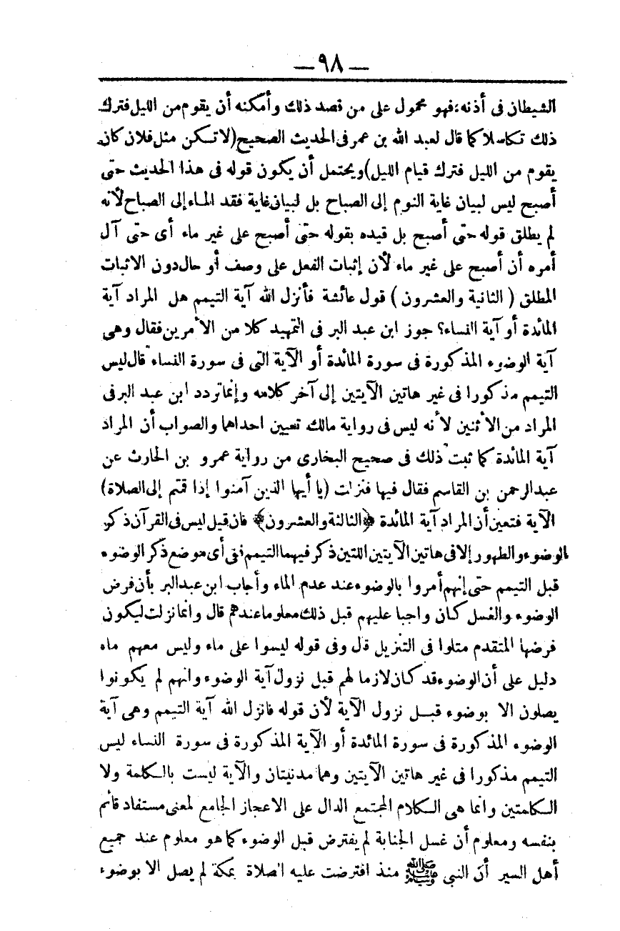 دَلِيلٌ عَلَى أَنَّ الْوُضُوءَ قَدْ كَانَ لَازِمًا لَهُمْ قَبْلَ نُزُولِ آيَةِ الْوُضُوءِ وَأَنَّهُمْ لَمْ يَكُونُوا يُصَلُّونَ إلَّا بِوُضُوءٍ قَبْلَ نُزُولِ الْآيَةِ؛ لِأَنَّ قَوْلَهُ فَأَنْزَلَ اللَّهُ آيَةَ التَّيَمُّمِ وَهِيَ آيَةُ الْوُضُوءِ الْمَذْكُورَةُ فِي سُورَةِ الْمَائِدَةِ أَوْ الْآيَةُ الْمَذْكُورَةُ فِي سُورَةِ النِّسَاءِ لَيْسَ التَّيَمُّمُ مَذْكُورًا فِي هَاتَيْنِ الْآيَتَيْنِ وَهُمَا مَدَنِيَّتَانِ، وَالْآيَةُ لَيْسَتْ بِالْكَلِمَةِ وَلَا الْكَلِمَتَيْنِ وَإِنَّمَا هِيَ الْكَلَامُ الْمُجْتَمِعُ الدَّالُ عَلَى الْإِعْجَازِ الْجَامِعِ لِمَعْنًى مُسْتَفَادٍ قَائِمٍ بِنَفْسِهِ.