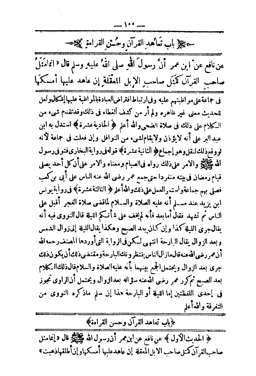 (بَابُ تَعَاهُدِ الْقُرْآنِ وَحُسْنِ الْقِرَاءَةِ) (الْحَدِيثُ الْأَوَّلُ) عَنْ نَافِعٍ عَنْ ابْنِ عُمَرَ أَنَّ رَسُولَ اللَّهِ - صَلَّى اللَّهُ عَلَيْهِ وَسَلَّمَ - قَالَ «إنَّمَا مَثَلُ صَاحِبِ الْقُرْآنِ كَمَثَلِ صَاحِبِ الْإِبِلِ الْمُعَقَّلَةِ إنْ عَاهَدَ عَلَيْهَا أَمْسَكَهَا وَإِنْ أَطْلَقَهَا ذَهَبَتْ»