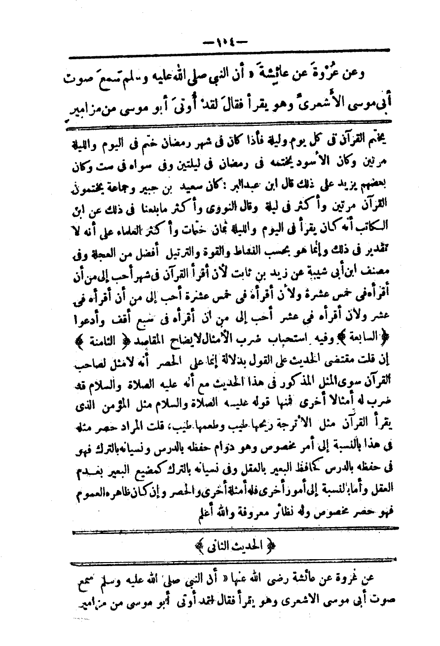 (الْحَدِيثُ الثَّانِي) عَنْ عُرْوَةَ عَنْ عَائِشَةَ - رَضِيَ اللَّهُ عَنْهَا - «أَنَّ النَّبِيَّ - صَلَّى اللَّهُ عَلَيْهِ وَسَلَّمَ - سَمِعَ صَوْتَ أَبِي مُوسَى الْأَشْعَرِيِّ وَهُوَ يَقْرَأُ فَقَالَ لَقَدْ أُوتِيَ أَبُو مُوسَى مِنْ مَزَامِيرِ