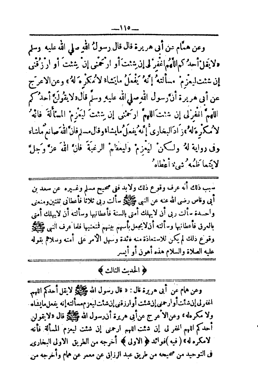 (الْحَدِيثُ الثَّالِثُ) وَعَنْ هَمَّامٍ عَنْ أَبِي هُرَيْرَةَ قَالَ: قَالَ رَسُولُ اللَّهِ - صَلَّى اللَّهُ عَلَيْهِ وَسَلَّمَ - «لَا يَقُلْ أَحَدُكُمْ اللَّهُمَّ اغْفِرْ لِي إنْ شِئْت أَوْ ارْحَمْنِي إنْ شِئْت أَوْ اُرْزُقْنِي إنْ شِئْت لِيَعْزِمْ مَسْأَلَتَهُ إنَّهُ يَفْعَلُ مَا يَشَاءُ وَلَا مُكْرِهَ لَهُ» وَعَنْ الْأَعْرَجِ عَنْ أَبِي هُرَيْرَةَ أَنَّ رَسُولَ اللَّهِ - صَلَّى اللَّهُ عَلَيْهِ وَسَلَّمَ - قَالَ «لَا يَقُولَنَّ أَحَدُكُمْ اللَّهُمَّ اغْفِرْ لِي إنْ شِئْت اللَّهُمَّ ارْحَمْنِي إنْ شِئْت لِيَعْزِمْ الْمَسْأَلَةَ فَإِنَّهُ لَا مُكْرِهَ لَهُ» (فِيهِ) فَوَائِدُ: