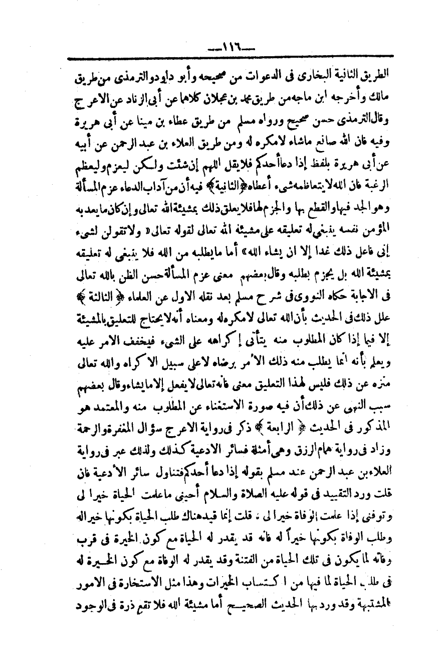 ـــــــــــــــــــــــــــــQالطَّرِيقِ الثَّانِيَةِ الْبُخَارِيُّ فِي الدَّعَوَاتِ مِنْ صَحِيحِهِ وَأَبُو دَاوُد وَالتِّرْمِذِيُّ مِنْ طَرِيقِ مَالِكٍ وَأَخْرَجَهُ ابْنُ مَاجَهْ مِنْ طَرِيقِ مُحَمَّدِ بْنِ عَجْلَانَ كِلَاهُمَا عَنْ أَبِي الزِّنَادِ عَنْ الْأَعْرَجِ وَقَالَ التِّرْمِذِيُّ حَسَنٌ صَحِيحٌ وَرَوَاهُ مُسْلِمٌ مِنْ طَرِيقِ عَطَاءِ بْنِ مِينَاءَ عَنْ أَبِي هُرَيْرَةَ وَفِيهِ «فَإِنَّ اللَّهَ صَانِعٌ مَا شَاءَ لَا مُكْرِهَ لَهُ» وَمِنْ طَرِيقِ الْعَلَاءِ بْنِ عَبْدِ الرَّحْمَنِ عَنْ أَبِيهِ عَنْ أَبِي هُرَيْرَةَ بِلَفْظِ «إذَا دَعَا أَحَدُكُمْ فَلَا يَقُلْ اللَّهُمَّ إنْ شِئْت وَلَكِنْ لِيَعْزِمْ وَلِيُعَظِّمْ الرَّغْبَةَ فَإِنَّ اللَّهَ لَا يَتَعَاظَمُهُ شَيْءٌ أَعْطَاهُ» .