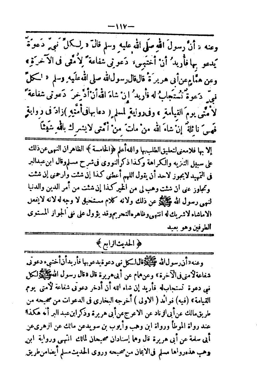 (الْحَدِيثُ الرَّابِعُ) وَعَنْهُ «أَنَّ رَسُولَ اللَّهِ - صَلَّى اللَّهُ عَلَيْهِ وَسَلَّمَ - قَالَ لِكُلِّ نَبِيٍّ دَعْوَةٌ يَدْعُو بِهَا فَأُرِيدُ أَنْ أَخْتَبِئَ دَعْوَتِي شَفَاعَةً لِأُمَّتِي فِي الْآخِرَةِ» وَعَنْ هَمَّامٍ عَنْ أَبِي هُرَيْرَةَ قَالَ قَالَ رَسُولُ اللَّهِ - صَلَّى اللَّهُ عَلَيْهِ وَسَلَّمَ - «لِكُلِّ نَبِيٍّ دَعْوَةٌ تُسْتَجَابُ لَهُ فَأُرِيدُ إنْ شَاءَ اللَّهُ أَنْ أَدَّخِرَ دَعْوَتِي شَفَاعَةً لِأُمَّتِي يَوْمَ الْقِيَامَةِ» (فِيهِ) فَوَائِدُ: