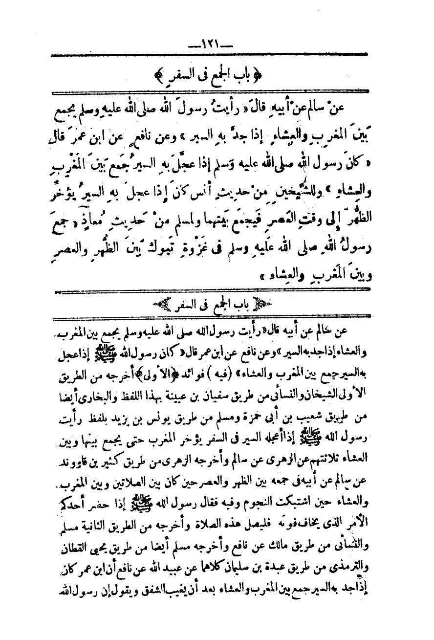 ِ عَنْ سَالِمٍ عَنْ أَبِيهِ قَالَ «رَأَيْت رَسُولَ اللَّهِ - صَلَّى اللَّهُ عَلَيْهِ وَسَلَّمَ - يَجْمَعُ بَيْنَ الْمَغْرِبِ وَالْعِشَاءِ إذَا جَدَّ بِهِ السَّيْرُ» وَعَنْ نَافِعٍ عَنْ ابْنِ عُمَرَ قَالَ «كَانَ رَسُولُ اللَّهِ - صَلَّى اللَّهُ عَلَيْهِ وَسَلَّمَ - إذَا عَجَّلَ بِهِ السَّيْرُ جَمَعَ بَيْنَ الْمَغْرِبِ وَالْعِشَاءِ» (فِيهِ) فَوَائِدُ.