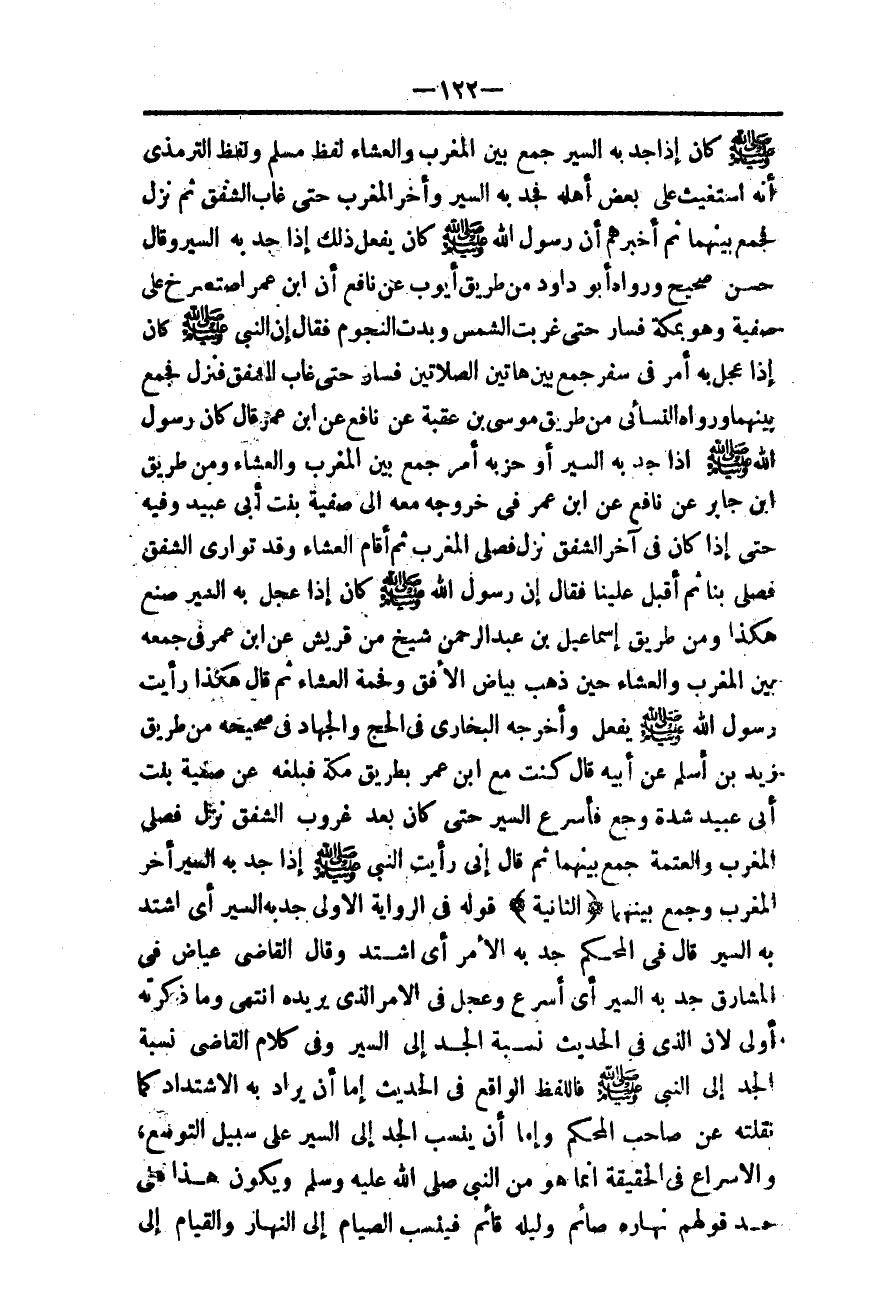 ـــــــــــــــــــــــــــــQ- صَلَّى اللَّهُ عَلَيْهِ وَسَلَّمَ - كَانَ إذَا جَدَّ بِهِ السَّيْرُ جَمَعَ بَيْنَ الْمَغْرِبِ وَالْعِشَاءِ» لَفْظُ مُسْلِمٍ وَلَفْظُ التِّرْمِذِيِّ «أَنَّهُ اُسْتُغِيثَ عَلَى بَعْضِ أَهْلِهِ فَجَدَّ بِهِ السَّيْرُ وَأَخَّرَ الْمَغْرِبَ حَتَّى غَابَ الشَّفَقُ ثُمَّ نَزَلَ فَجَمَعَ بَيْنَهُمَا ثُمَّ أَخْبَرَهُمْ أَنَّ رَسُولَ اللَّهِ - صَلَّى اللَّهُ عَلَيْهِ وَسَلَّمَ - كَانَ يَفْعَلُ ذَلِكَ إذَا جَدَّ بِهِ السَّيْرُ» وَقَالَ حَسَنٌ صَحِيحٌ وَرَوَاهُ أَبُو دَاوُد مِنْ طَرِيقِ أَيُّوبَ عَنْ نَافِعٍ «أَنَّ ابْنَ عُمَرَ اسْتَصْرَخَ عَلَى صَفِيَّةَ وَهُوَ بِمَكَّةَ فَسَارَ حَتَّى غَرَبَتْ الشَّمْسُ وَبَدَتْ النُّجُومُ فَقَالَ إنَّ النَّبِيَّ - صَلَّى اللَّهُ عَلَيْهِ وَسَلَّمَ - كَانَ إذَا عَجَّلَ بِهِ أَمْرٌ فِي سَفَرٍ جَمَعَ بَيْنَ هَاتَيْنِ الصَّلَاتَيْنِ فَسَارَ حَتَّى غَابَ الشَّفَقُ فَنَزَلَ فَجَمَعَ بَيْنَهُمَا» .