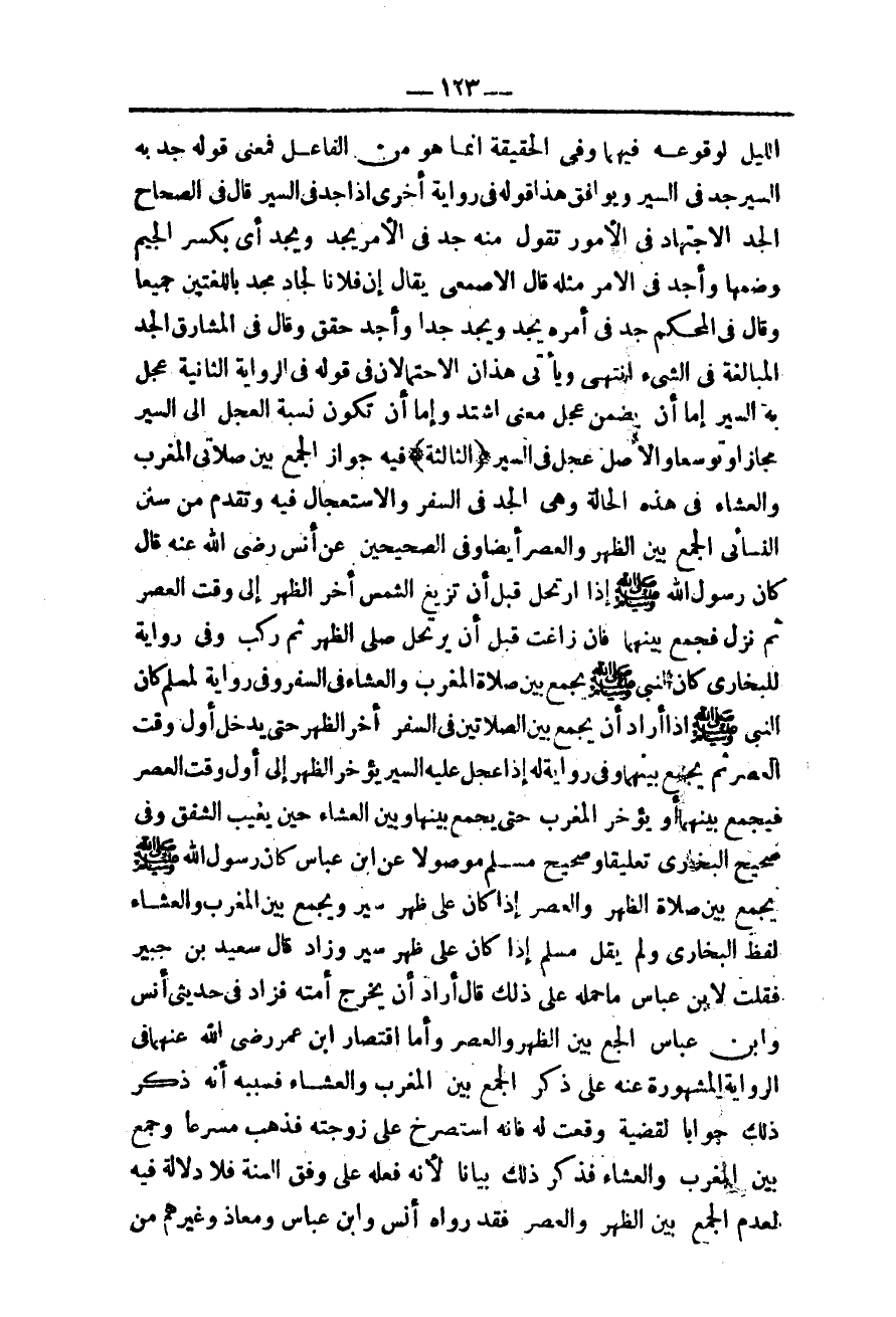 (الثَّالِثَةُ) فِيهِ جَوَازُ الْجَمْعِ بَيْنَ صَلَاتَيْ الْمَغْرِبِ وَالْعِشَاءِ فِي هَذِهِ الْحَالَةِ وَهِيَ الْجَدُّ فِي السَّفَرِ وَالِاسْتِعْجَالُ فِيهِ وَتَقَدَّمَ مِنْ سُنَنِ النَّسَائِيّ الْجَمْعُ بَيْنَ الظُّهْرِ وَالْعَصْرِ أَيْضًا وَفِي الصَّحِيحَيْنِ عَنْ أَنَسٍ - رَضِيَ اللَّهُ عَنْهُ - قَالَ «كَانَ رَسُولُ اللَّهِ - صَلَّى اللَّهُ عَلَيْهِ وَسَلَّمَ - إذَا ارْتَحَلَ قَبْلَ أَنْ تَزِيغَ الشَّمْسُ أَخَّرَ الظُّهْرَ إلَى وَقْتِ الْعَصْرِ ثُمَّ نَزَلَ فَجَمَعَ بَيْنَهُمَا فَإِنْ زَاغَتْ قَبْلَ أَنْ يَرْتَحِلَ صَلَّى الظُّهْرَ ثُمَّ رَكِبَ» وَفِي رِوَايَةٍ لِلْبُخَارِيِّ «كَانَ النَّبِيُّ - صَلَّى اللَّهُ عَلَيْهِ وَسَلَّمَ - يَجْمَعُ بَيْنَ صَلَاةِ الْمَغْرِبِ وَالْعِشَاءِ فِي السَّفَرِ» وَفِي رِوَايَةٍ لِمُسْلِمٍ «كَانَ النَّبِيُّ - صَلَّى اللَّهُ عَلَيْهِ وَسَلَّمَ - إذَا أَرَادَ أَنْ يَجْمَعَ بَيْنَ الصَّلَاتَيْنِ فِي السَّفَرِ أَخَّرَ الظُّهْرَ حَتَّى يَدْخُلَ أَوَّلُ وَقْتِ الْعَصْرِ ثُمَّ يَجْمَعَ بَيْنَهُمَا» وَفِي رِوَايَةٍ لَهُ «إذَا عَجَّلَ عَلَيْهِ السَّيْرُ يُؤَخِّرُ الظُّهْرَ إلَى أَوَّلِ وَقْتِ الْعَصْرِ فَيَجْمَعُ بَيْنَهُمَا أَوْ يُؤَخِّرُ الْمَغْرِبَ حَتَّى يَجْمَعَ بَيْنَهُمَا وَبَيْنَ الْعِشَاءِ حِينَ يَغِيبُ الشَّفَقُ» وَفِي صَحِيحِ الْبُخَارِيِّ تَعْلِيقًا وَصَحِيحِ مُسْلِمٍ مَوْصُولًا عَنْ ابْنِ عَبَّاسٍ «كَانَ رَسُولُ اللَّهِ - صَلَّى اللَّهُ عَلَيْهِ وَسَلَّمَ - يَجْمَعُ بَيْنَ صَلَاةِ الظُّهْرِ وَالْعَصْرِ إذَا كَانَ عَلَى ظَهْرِ سَيْرٍ وَيَجْمَعُ بَيْنَ الْمَغْرِبِ وَالْعِشَاءِ» لَفْظُ الْبُخَارِيِّ وَلَمْ يَقُلْ مُسْلِمٌ «إذَا كَانَ عَلَى ظَهْرِ سَيْرٍ» وَزَادَ قَالَ سَعِيدُ بْنُ جُبَيْرٍ فَقُلْت لِابْنِ عَبَّاسٍ مَا حَمَلَهُ عَلَى ذَلِكَ قَالَ أَرَادَ أَنْ يُخْرِجَ أُمَّتَهُ فَزَادَ فِي حَدِيثَيْ أَنَسٍ وَابْنِ عَبَّاسٍ الْجَمْعَ بَيْنَ الظُّهْرِ وَالْعَصْرِ وَأَمَّا اقْتِصَارُ ابْنِ عُمَرَ - رَضِيَ اللَّهُ عَنْهُمَا - فِي الرِّوَايَةِ الْمَشْهُورَةِ عَنْهُ عَلَى ذِكْرِ الْجَمْعِ بَيْنَ الْمَغْرِبِ وَالْعِشَاءِ فَسَبَبُهُ أَنَّهُ ذَكَرَ ذَلِكَ جَوَابًا لِقَضِيَّةٍ وَقَعَتْ لَهُ فَإِنَّهُ اُسْتُصْرِخَ عَلَى زَوْجَتِهِ فَذَهَبَ مُسْرِعًا وَجَمَعَ بَيْنَ الْمَغْرِبِ وَالْعِشَاءِ فَذَكَرَ ذَلِكَ بَيَانًا لِأَنَّهُ فَعَلَهُ عَلَى وَفْقِ السُّنَّةِ فَلَا دَلَالَةَ فِيهِ لِعَدَمِ الْجَمْعِ بَيْنَ الظُّهْرِ وَالْعَصْرِ فَقَدْ رَوَاهُ أَنَسٌ وَابْنُ عَبَّاسٍ وَمُعَاذٌ وَغَيْرُهُمْ مِنْ