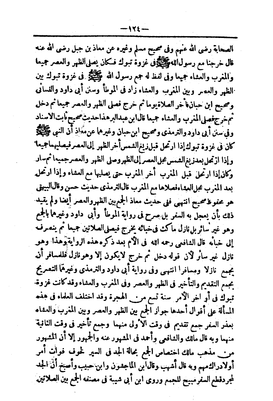 ـــــــــــــــــــــــــــــQالصَّحَابَةِ - رَضِيَ اللَّهُ عَنْهُمْ - وَفِي صَحِيحِ مُسْلِمٍ وَغَيْرِهِ عَنْ مُعَاذِ بْنِ جَبَلٍ - رَضِيَ اللَّهُ عَنْهُ - قَالَ «خَرَجْنَا مَعَ رَسُولِ اللَّهِ - صَلَّى اللَّهُ عَلَيْهِ وَسَلَّمَ - فِي غَزْوَةِ تَبُوكَ فَكَانَ يُصَلِّي الظُّهْرَ وَالْعَصْرَ جَمِيعًا وَالْمَغْرِبَ وَالْعِشَاءَ جَمِيعًا» وَفِي لَفْظٍ لَهُ «جَمَعَ رَسُولُ اللَّهِ - صَلَّى اللَّهُ عَلَيْهِ وَسَلَّمَ - فِي غَزْوَةِ تَبُوكَ بَيْنَ الظُّهْرِ وَالْعَصْرِ وَبَيْنَ الْمَغْرِبِ وَالْعِشَاءِ» زَادَ فِي الْمُوَطَّإِ وَسُنَنِ أَبِي دَاوُد وَالنَّسَائِيُّ وَصَحِيحِ ابْنِ حِبَّانَ «فَأَخَّرَ الصَّلَاةَ يَوْمًا ثُمَّ خَرَجَ فَصَلَّى الظُّهْرَ وَالْعَصْرَ جَمِيعًا ثُمَّ دَخَلَ ثُمَّ خَرَجَ فَصَلَّى الْمَغْرِبَ وَالْعِشَاءَ جَمِيعًا» قَالَ ابْنُ عَبْدِ الْبَرِّ هَذَا حَدِيثٌ صَحِيحٌ ثَابِتُ الْإِسْنَادِ.