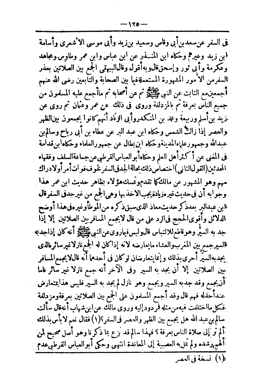ـــــــــــــــــــــــــــــQفِي السَّفَرِ عَنْ سَعْدِ بْنِ أَبِي وَقَّاصٍ وَسَعِيدِ بْنِ زَيْدٍ وَأَبِي مُوسَى الْأَشْعَرِيِّ وَأُسَامَةَ بْنِ زَيْدٍ وَغَيْرِهِمْ وَحَكَاهُ ابْنُ الْمُنْذِرِ عَنْ ابْنِ عَبَّاسٍ وَابْنِ عُمَرَ وَطَاوُسٍ وَمُجَاهِدٍ وَعِكْرِمَةَ وَأَبِي ثَوْرٍ وَإِسْحَاقَ قَالَ وَبِهِ أَقُولُ وَقَالَ الْبَيْهَقِيُّ الْجَمْعُ بَيْنَ الصَّلَاتَيْنِ بِعُذْرِ السَّفَرِ مِنْ الْأُمُورِ الْمَشْهُورَةِ الْمُسْتَعْمَلَةِ فِيمَا بَيْنَ الصَّحَابَةِ وَالتَّابِعِينَ - رَضِيَ اللَّهُ عَنْهُمْ أَجْمَعِينَ - مَعَ الثَّابِتِ عَنْ النَّبِيِّ - صَلَّى اللَّهُ عَلَيْهِ وَسَلَّمَ - ثُمَّ عَنْ أَصْحَابِهِ ثُمَّ مَا أَجْمَعَ عَلَيْهِ الْمُسْلِمُونَ مِنْ جَمِيعِ النَّاسِ بِعَرَفَةَ ثُمَّ بِالْمُزْدَلِفَةِ وَرُوِيَ فِي ذَلِكَ عَنْ عُمَرَ وَعُثْمَانَ ثُمَّ رُوِيَ عَنْ زَيْدِ بْنِ أَسْلَمَ وَرَبِيعَةَ وَمُحَمَّدِ بْنِ الْمُنْكَدِرِ وَأَبِي الزِّنَادِ أَنَّهُمْ كَانُوا يَجْمَعُونَ بَيْنَ الظُّهْرِ وَالْعَصْرِ إذَا زَالَتْ الشَّمْسُ وَحَكَاهُ ابْنُ عَبْدِ الْبَرِّ عَنْ عَطَاءِ بْنِ أَبِي رَبَاحٍ وَسَالِمِ بْنِ عَبْدِ اللَّهِ وَجُمْهُورِ عُلَمَاءِ الْمَدِينَةِ وَحَكَاهُ ابْنُ بَطَّالٍ عَنْ جُمْهُورِ الْعُلَمَاءِ وَحَكَاهُ ابْنُ قُدَامَةَ فِي الْمُغْنِي عَنْ أَكْثَرِ أَهْلِ الْعِلْمِ وَحَكَاهُ أَبُو الْعَبَّاسِ الْقُرْطُبِيُّ عَنْ جَمَاعَةِ السَّلَفِ وَفُقَهَاءِ الْمُحَدِّثِينَ.