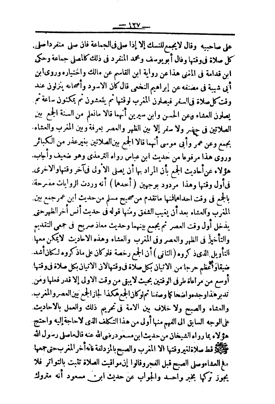 ـــــــــــــــــــــــــــــQعَلَى صَاحِبِيهِ وَقَالَ لَا يَجْمَعُ لِلنُّسُكِ إلَّا إذَا صَلَّى فِي الْجَمَاعَةِ فَإِنْ صَلَّى مُنْفَرِدًا صَلَّى كُلَّ صَلَاةٍ فِي وَقْتِهَا وَقَالَ أَبُو يُوسُفَ وَمُحَمَّدٌ الْمُنْفَرِدُ فِي ذَلِكَ كَالْمُصَلِّي جَمَاعَةً وَحَكَى ابْنُ قُدَامَةَ فِي الْمُغْنِي هَذَا عَنْ رِوَايَةِ ابْنِ الْقَاسِمِ عَنْ مَالِكٍ وَاخْتِيَارِهِ وَرَوَى ابْنُ أَبِي شَيْبَةَ فِي مُصَنَّفِهِ عَنْ إبْرَاهِيمَ النَّخَعِيّ قَالَ كَانَ الْأَسْوَدُ وَأَصْحَابُهُ يَنْزِلُونَ عِنْدَ وَقْتِ كُلِّ صَلَاةٍ فِي السَّفَرِ فَيُصَلُّونَ الْمَغْرِبَ لِوَقْتِهَا ثُمَّ يَتَعَشَّوْنَ ثُمَّ يَمْكُثُونَ سَاعَةً ثُمَّ يُصَلُّونَ الْعِشَاءَ وَعَنْ الْحَسَنِ وَابْنِ سِيرِينَ أَنَّهُمَا قَالَا مَا نَعْلَمُ مِنْ السُّنَّةِ الْجَمْعَ بَيْنَ الصَّلَاتَيْنِ فِي حَضَرٍ وَلَا سَفَرٍ إلَّا بَيْنَ الظُّهْرِ وَالْعَصْرِ بِعَرَفَةَ وَبَيْنَ الْمَغْرِبِ وَالْعِشَاءِ بِجَمْعٍ وَعَنْ عُمَرَ وَأَبِي مُوسَى أَنَّهُمَا قَالَا الْجَمْعُ بَيْنَ الصَّلَاتَيْنِ بِغَيْرِ عُذْرٍ مِنْ الْكَبَائِرِ وَرُوِيَ هَذَا مَرْفُوعًا مِنْ حَدِيثِ ابْنِ عَبَّاسٍ رَوَاهُ التِّرْمِذِيُّ وَهُوَ ضَعِيفٌ وَأَجَابَ هَؤُلَاءِ عَنْ أَحَادِيثِ الْجَمْعِ بِأَنَّ الْمُرَادَ بِهَا أَنْ يُصَلِّيَ الْأُولَى فِي آخِرِ وَقْتِهَا وَالْأُخْرَى فِي أَوَّلِ وَقْتِهَا وَهَذَا مَرْدُودٌ بِوَجْهَيْنِ:
