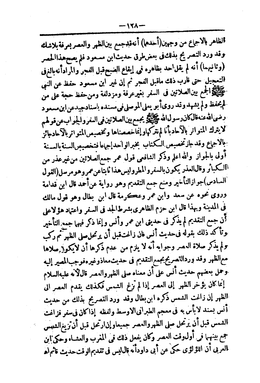 (أَحَدُهُمَا) أَنَّهُ قَدْ جَمَعَ بَيْنَ الظُّهْرِ وَالْعَصْرِ بِعَرَفَةَ بِلَا شَكٍّ وَقَدْ وَرَدَ التَّصْرِيحُ بِذَلِكَ فِي بَعْضِ طُرُقِ حَدِيثِ ابْنِ مَسْعُودٍ فَلَمْ يَصِحَّ هَذَا الْحَصْرُ (وَثَانِيهِمَا) أَنَّهُ لَمْ يَقُلْ أَحَدٌ بِظَاهِرِهِ فِي إيقَاعِ الصُّبْحِ قَبْلَ الْفَجْرِ وَالْمُرَادُ أَنَّهُ بَالَغَ فِي التَّعْجِيلِ حَتَّى قَارَبَ ذَلِكَ مَا قَبْلَ الْفَجْرِ ثُمَّ إنَّ غَيْرَ ابْنِ مَسْعُودٍ حَفِظَ عَنْ النَّبِيِّ - صَلَّى اللَّهُ عَلَيْهِ وَسَلَّمَ - الْجَمْعَ بَيْنَ الصَّلَاتَيْنِ فِي السَّفَرِ بِغَيْرِ عَرَفَةَ وَمُزْدَلِفَةَ وَمَنْ حَفِظَ حُجَّةٌ عَلَى مَنْ لَمْ يَحْفَظْ وَلَمْ يَشْهَدْ وَقَدْ رَوَى أَبُو يَعْلَى الْمَوْصِلِيُّ فِي مُسْنَدِهِ بِإِسْنَادٍ جَيِّدٍ عَنْ ابْنِ مَسْعُودٍ - رَضِيَ اللَّهُ عَنْهُ - قَالَ «كَانَ رَسُولُ اللَّهِ - صَلَّى اللَّهُ عَلَيْهِ وَسَلَّمَ - يَجْمَعُ بَيْنَ الصَّلَاتَيْنِ فِي السَّفَرِ» وَالْجَوَابُ عَنْ قَوْلِهِمْ لَا يُتْرَكُ الْمُتَوَاتِرُ بِالْآحَادِ بِأَنَّا لَمْ نَتْرُكْهَا وَإِنَّمَا خَصَّصْنَاهَا وَتَخْصِيصُ الْمُتَوَاتِرِ بِالْآحَادِ جَائِزٌ بِالْإِجْمَاعِ وَقَدْ جَازَ تَخْصِيصُ الْكِتَابِ بِخَبَرِ الْوَاحِدِ إجْمَاعًا فَتَخْصِيصُ السُّنَّةِ بِالسُّنَّةِ أَوْلَى بِالْجَوَازِ وَاَللَّهُ أَعْلَمُ.